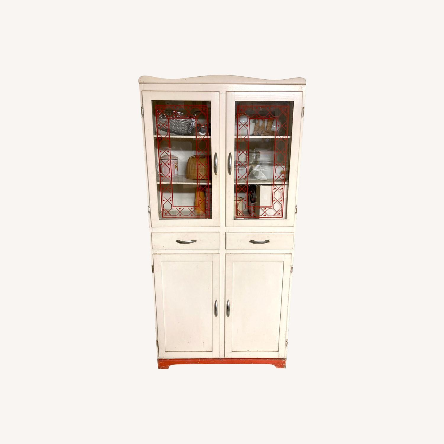 Seller's Notes:A charming retro cabinet that offers multiple storage options. Upper section has glass doors stencilled with red graphic pattern and three shelves (approximately 8.5"h per shelf). Lower section has two shelves (approximately 12–13"h per shelf) and middle section has two drawers (interior 12.5w x 9.5d x 2.25h). Bottom base accented red, matching glass door motif. A well-loved piece with obvious scratches, discoloration, and stains (see photos). Has a lot more usage to give with its original hardware and sturdy structure. Doors and drawers open/close smoothly, aligns correctly, and doors stay closed with pin-catch closures. From a pet/smoke free environment.
