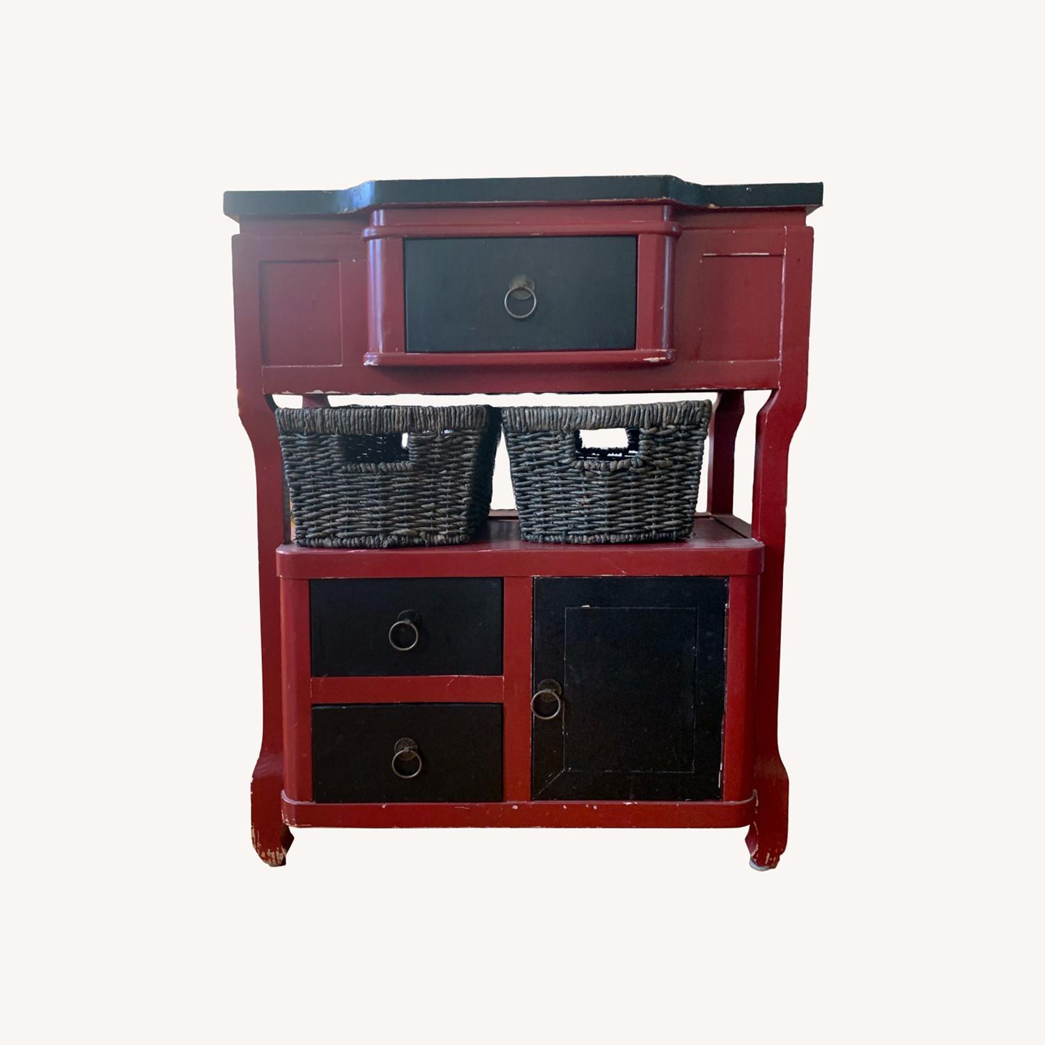 Seller's Notes:Retro Vintage Kitchen Buffet Bar Cart Sideboard It's a modern piece made to look vintage in style. The sort of piece you might find at Home Goods. Paint is chipping, and there is surface wear all over, but it has a lot of character and supports a lot of weight (I used it to display wine and alcohol bottles) Measures 29" wide X 16" deep X 36" tall. Thanks!