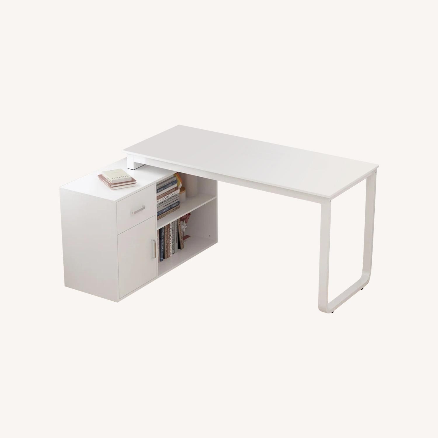 Create the ultimate productivity station in your office or spare room with this L-shaped desk. Made from a blend of solid and engineered wood, it features a solid white hue that's easy to pair with contemporary colors and neutral accents. It features a rectangular tabletop balanced on one sled-style leg and one bookshelf. One drawer and two shelves are just right for storing your books, tech accessories, and office supplies, while the table has plenty of room for your computer, keyboard, and a cup of coffee.
