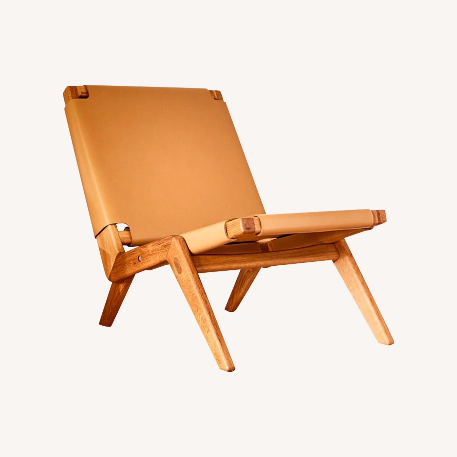 Seller's Notes:Folding wood and leather camp chair from Revival Rugs -- also called the "Aide-De-Camp Folding Chair." I've had the chair for 3 years but only use it as clothing storage, so it appears as new with VERY little wear. Product details: - Natural finished solid ash - Coated tan leather, 3-4 mm thick - Folding feature for convenient storage - Made in Istanbul, Turkey - Dimensions: 22”w x 28”h x 32”d x 14” seat height - No assembly required - Not for outdoor use Additional notes: The Design Turkish designer Gizem Yuce sought to create an armchair which was functional, flexible, and elegant. She elevated this classic camp chair with luxury materials, like pale solid oak and supple tan leather, without sacrificing utility: it folds for easy storage or travel. The Material Finished leather will resist liquids and loosen slightly over time, aging naturally and becoming more supple and luxurious after years of use. Natural-finished solid ash is a traditional wood admired for its smooth touch, durability, and bright hue. The Maker Our partner is a young company based in Istanbul, Turkey, where it was founded nearly 20 years ago. They specialize in producing chairs, and work mostly with solid wood craftsmanship, leather, and metal.