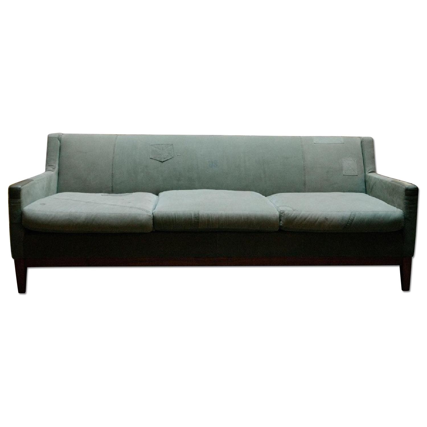 Seller's Notes:A great mid century sofa. All hardwood body, beautiful lines. This sofa was reupholstered with Korean War Era military shirts by Revive Designs in Portland, Oregon. Leather details. Totally great and one of a kind! Original retail over $2000. The arms have some cat snags, but this sofa still has a ton of life!