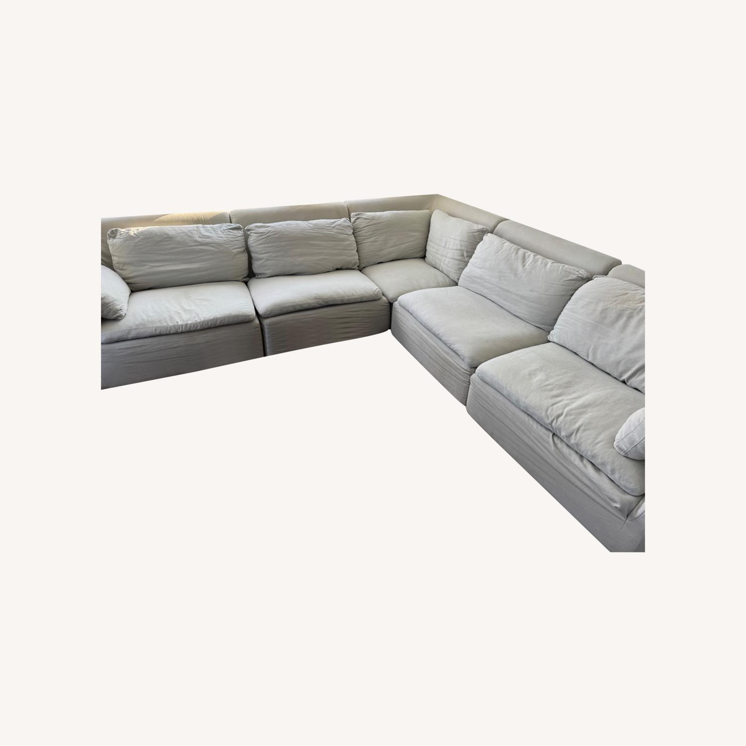 Seller's Notes:Very nice cloud slope arm sectional in classic depth includes: 1 corner, 1 left, 1 right, and 2 armless pieces. Fabric is brushed Belgian flax linen cotton in dove. One cushion cover needs replaced but otherwise in great shape.