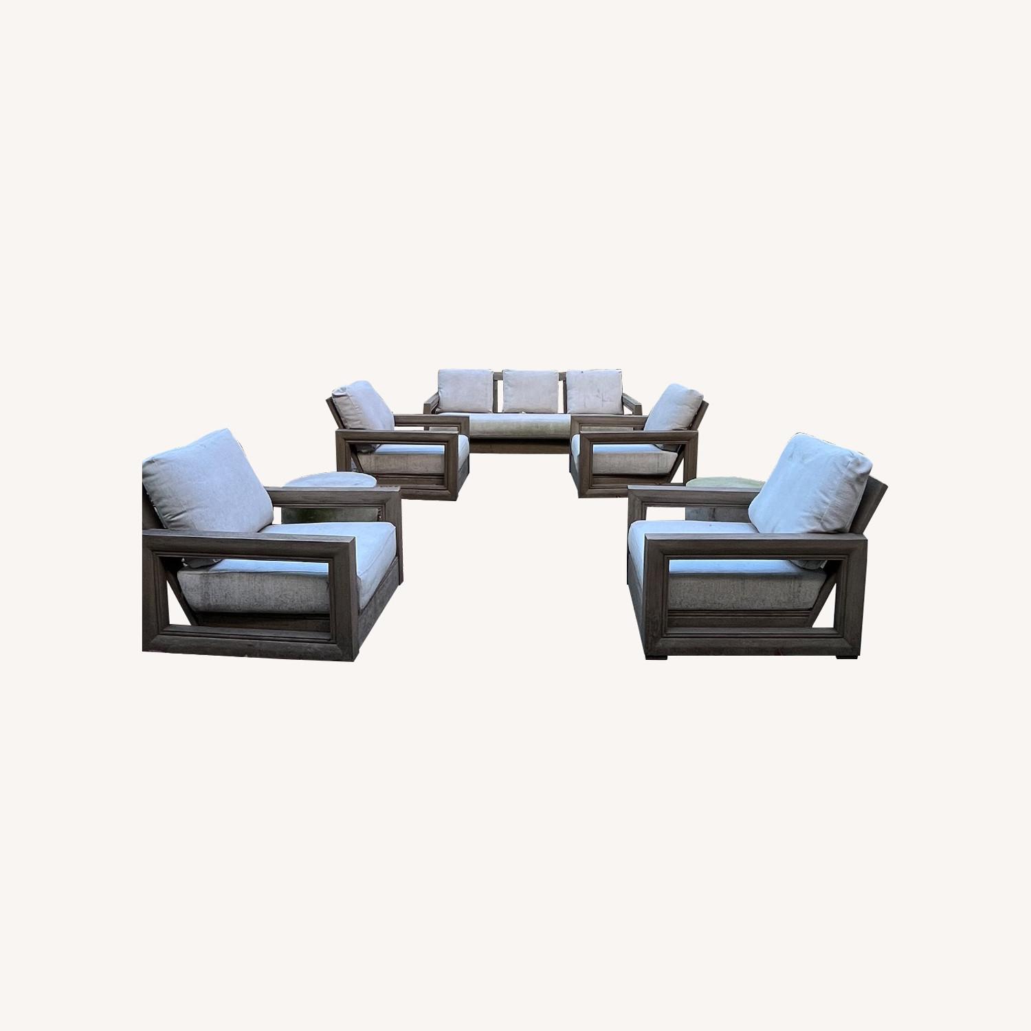Seller's Notes:Restoration Hardware Costa Teak Set, including one sofa, 4 lounge chairs, and an additional 2 Cosimo Round Side Tables. Altogether would retail for around $13000. Normal wear and tear due to the pieces being outdoors. New owner might want to have the items cleaned, but it would be easy to do so. Sofa and lounge chairs come with Performance Textured Linen Weave - Dove fabric.
