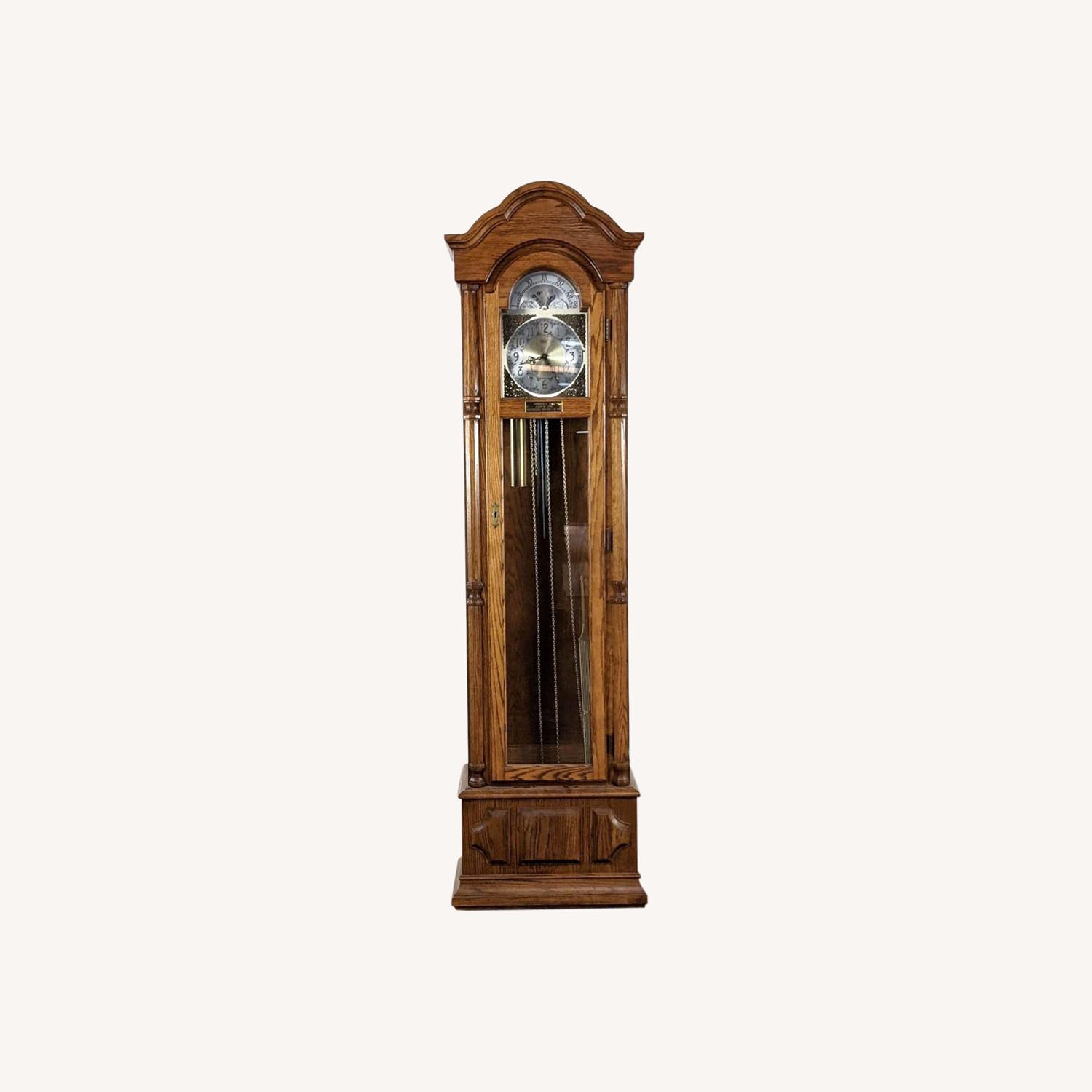Seller's Notes:This traditional design, featuring a graceful bonnet pediment with decorative overlay on the crown, comes with a Treasure Oak finish on select hardwood solids. Westminster Chimes. Brand: Ridgeway Deluxe DASHING Chiming Grandfather Clock . Model: Ridgeway Kingsley. Retail price: 4075.00. #SKU: 1048133