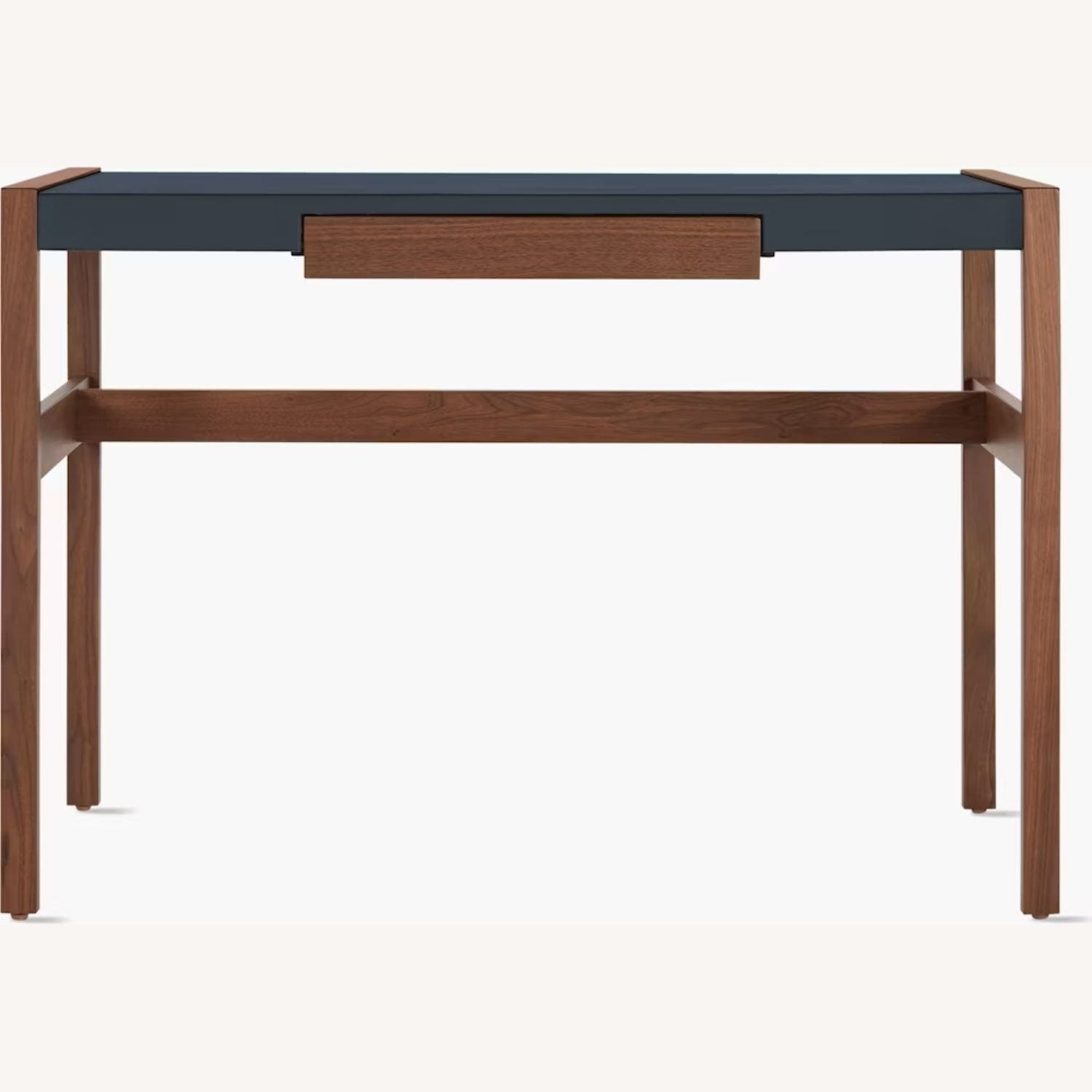 Seller's Notes:The Risom desk was originally designed by Jens Risom in 1968. It has a solid walnut frame, black stain resistant leather top and a drawer with a removable wood tray. It's a beautifully designed desk for small spaces. We've enjoyed it in the loft/office of our apartment. We're moving and hope that someone else will be able to enjoy the desk as much as we did.