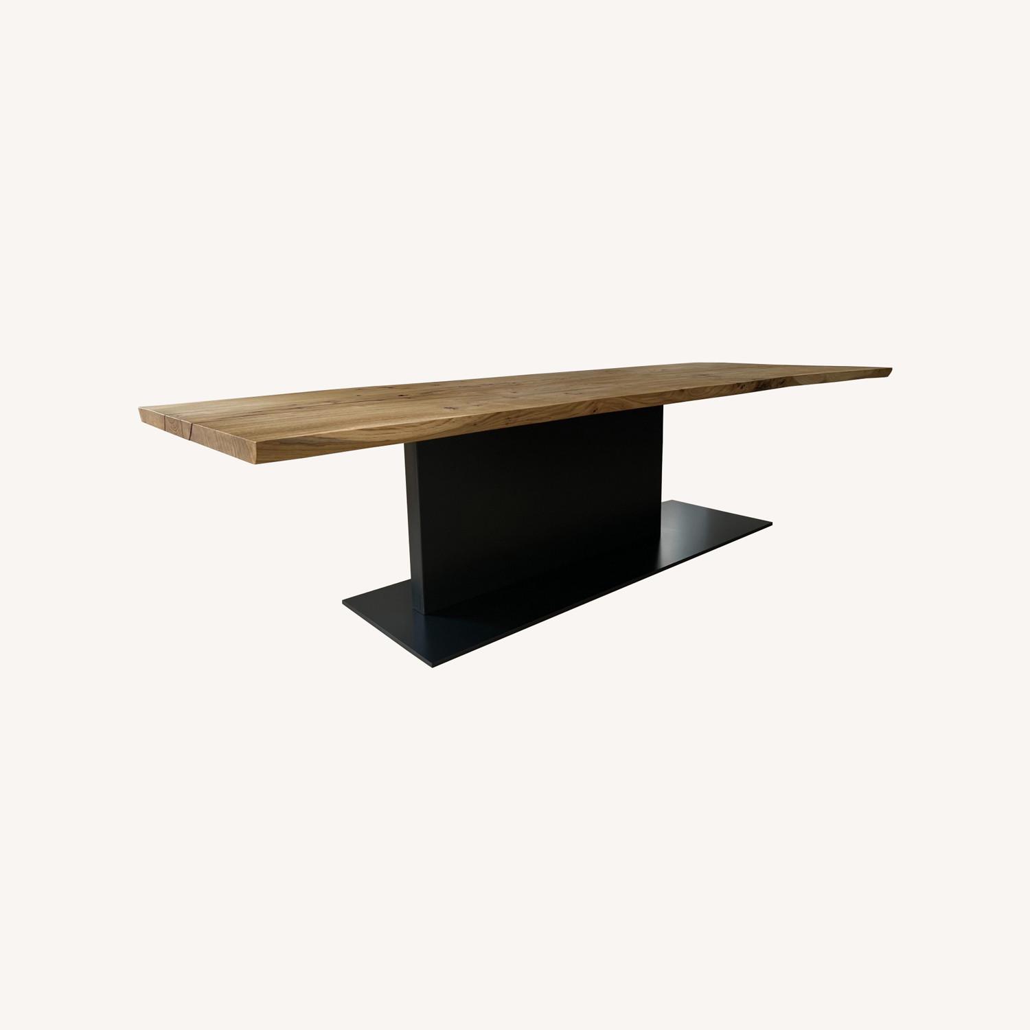 Seller's Notes:Beautiful custom Italian dining table of two planks of solid knotted oak and solid iron cantilevered base. Brushed vintage finish on wood. Only one year old. Delivery covered!