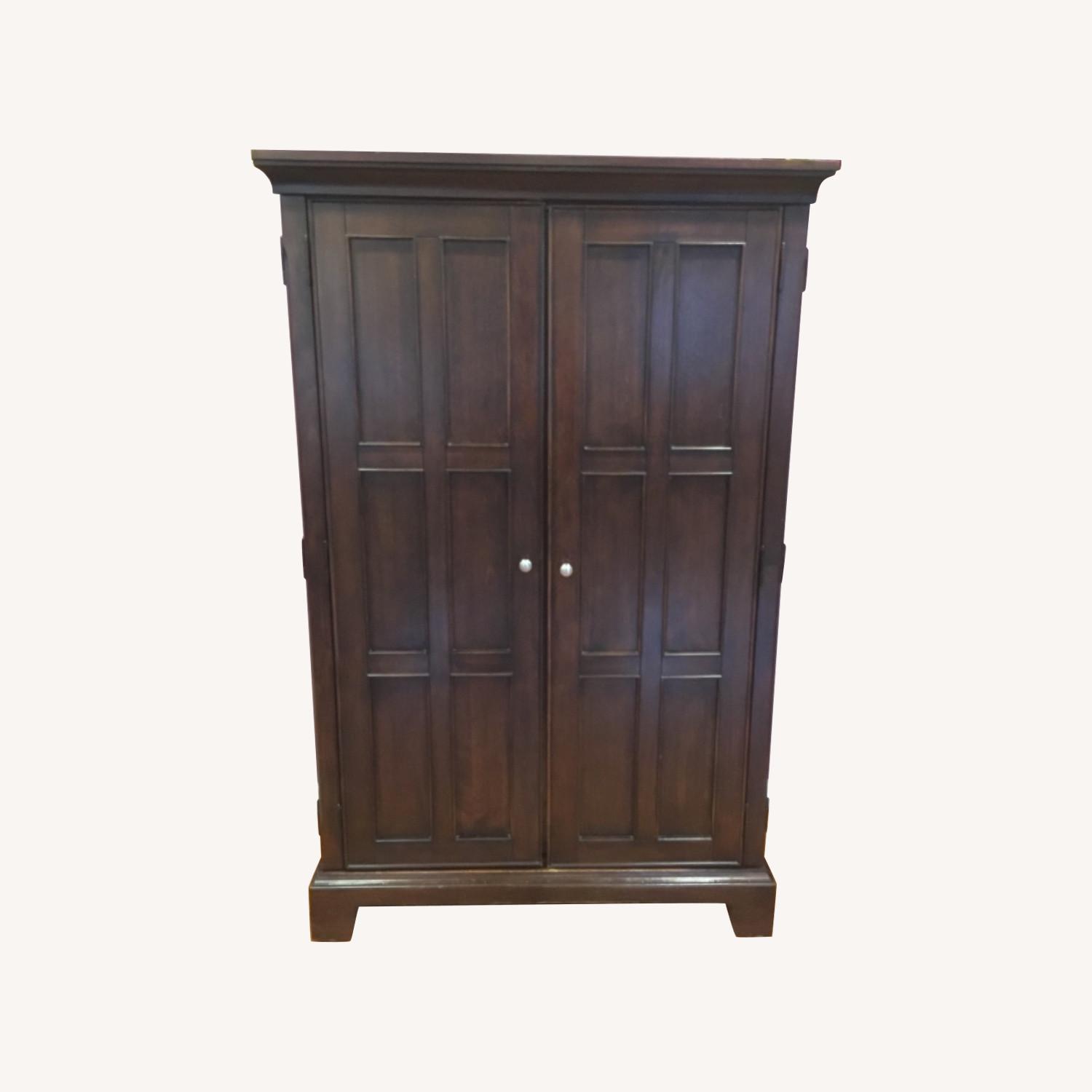 Seller's Notes:The Riverside Urban Cherry Computer Armoire has a pull-out task light, pull-out keyboard tray and a pull-out tray for a printer/scanner. It also has a file drawer and built in master power control panel. It has a worn spot on the inside from being used as a home office. COMPUTER NOT INCLUDED. Picture includes computer for specs. It can fit a 25 inch monitor.