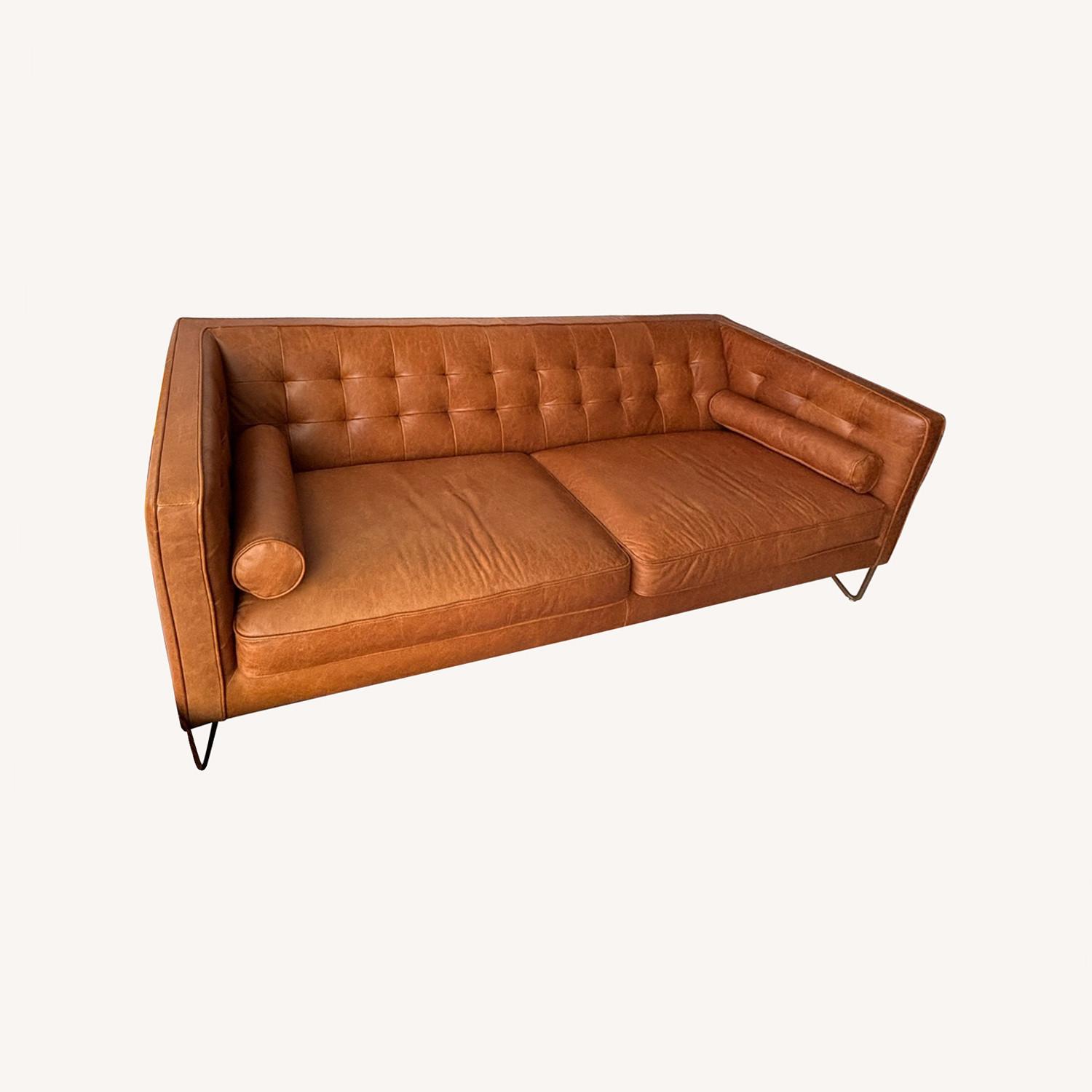 Seller's Notes:Gorgeous genuine leather on a solid wood frame. Condition: Excellent. Comfort: This couch is super comfortable, with just the right amount of support and give. The seat is perfectly deep, and it's slightly sloped into the back cushions so it cradles you (but still allows you to get up easily) and is great for a nap!!! I was skeptical of the boxy armrests, but they're the perfect shape/width/height to rest your head and/or back-- just like an armchair! History: Purchased a little over a year ago. The only assembly required was screwing on the legs. Reason for selling: I truly love this couch, but recently moved apartments and this couch physically does not fit in my living room. Otherwise, I would've loved to keep it forever! Pricing: If you're near NYC/can arrange for pickup, this is certainly OBO :)