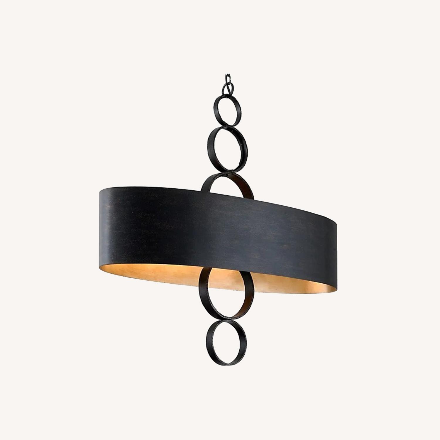 Seller's Notes:A grand piece of craftsmanship for large kitchens or dining rooms. The Rivington Linear Suspension by Troy Lighting is tall, wide and quite clearly designed to impress. Its elliptical shade and decorative column of rings are all made out of Hand-Forged Iron, a fact that is made obvious to anyone just looking at the piece with all the rough textures left proudly in place and highlighted by a Charred Copper finish (dark, but with coppery flecks scattered throughout). The interior of the shade is coated in a luxurious Enchanted Silver Leaf which, cool during the day, becomes warm and brilliantly reflective when the fixture is turned on. Troy Lighting, headquartered in California, designs and manufactures indoor and outdoor lighting fixtures, utilizing hand-forged iron and hand-applied finishes to create quality products with high-style appeal. *Scuff on the top side of the metal shade - not very noticeable when light is on (could be refinished/fixed easily or positioned where it wouldn't be noticeable) see photo*