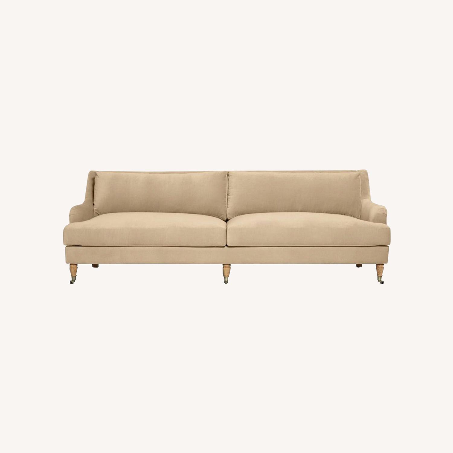 Seller's Notes:The Rivington sofa from the exclusive Ginny Macdonald collection for Lulu and Georgia features low, sloping arms and tailored detailing that fits just about any aesthetic and upholstered in Brie velvet.. Brand: Lulu and Georgia. Model: Rivington. Material: wood,fabric. Seat heigt: 19. Retail price: $4298. Gently used - any blemishes or damage will be included in the photos. #SKU: 1062964. Tags: liquidation,wood,transitional,modern,fabric,contemporary