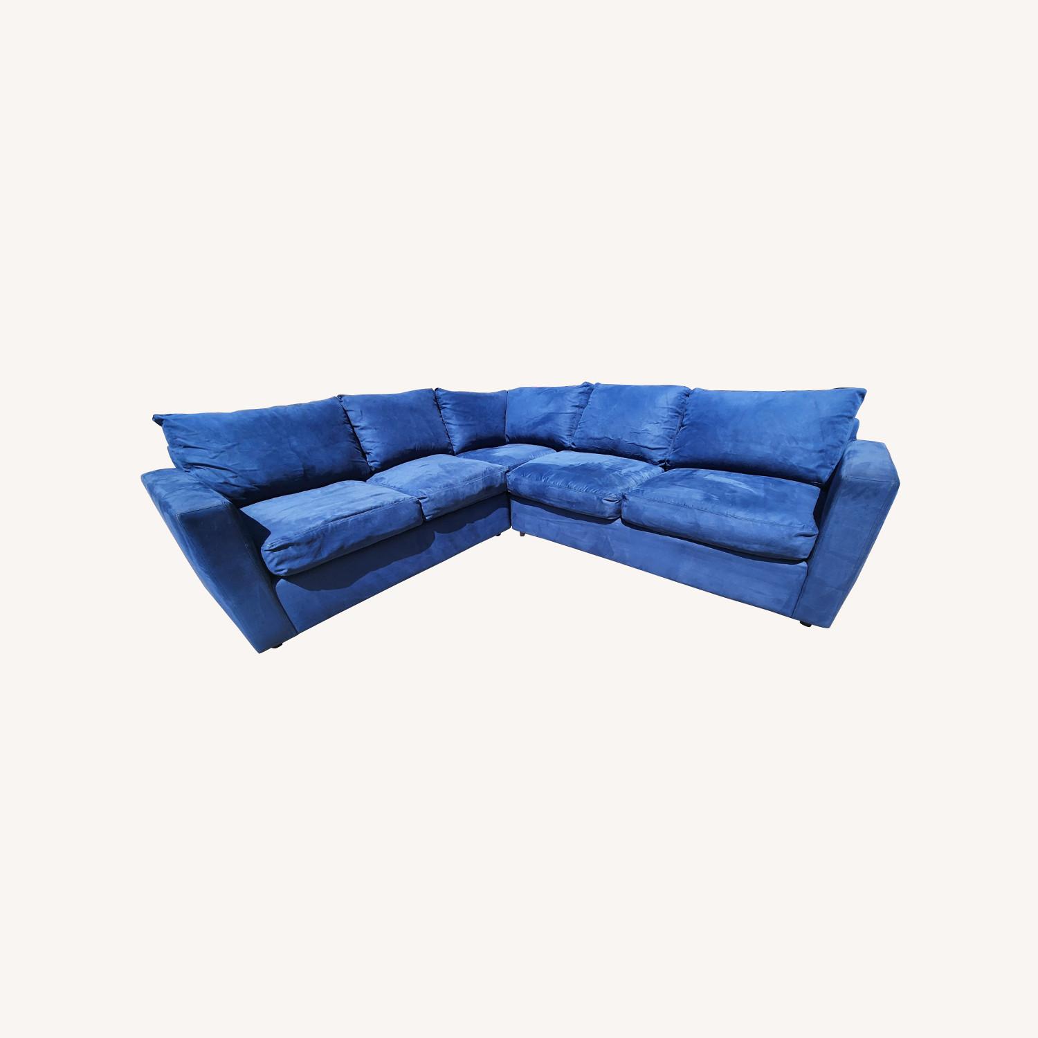 Seller's Notes:High end brand, Robb and Stucky downed Sectional. Vibrant, blue suede fabric with blue stitch trim. Feather filled seats and pillows. Modern, firm look, but comfy as well. Has a built in pullout bed. In excellent condition. Dimensions 103 x 94. 29" high. NCI