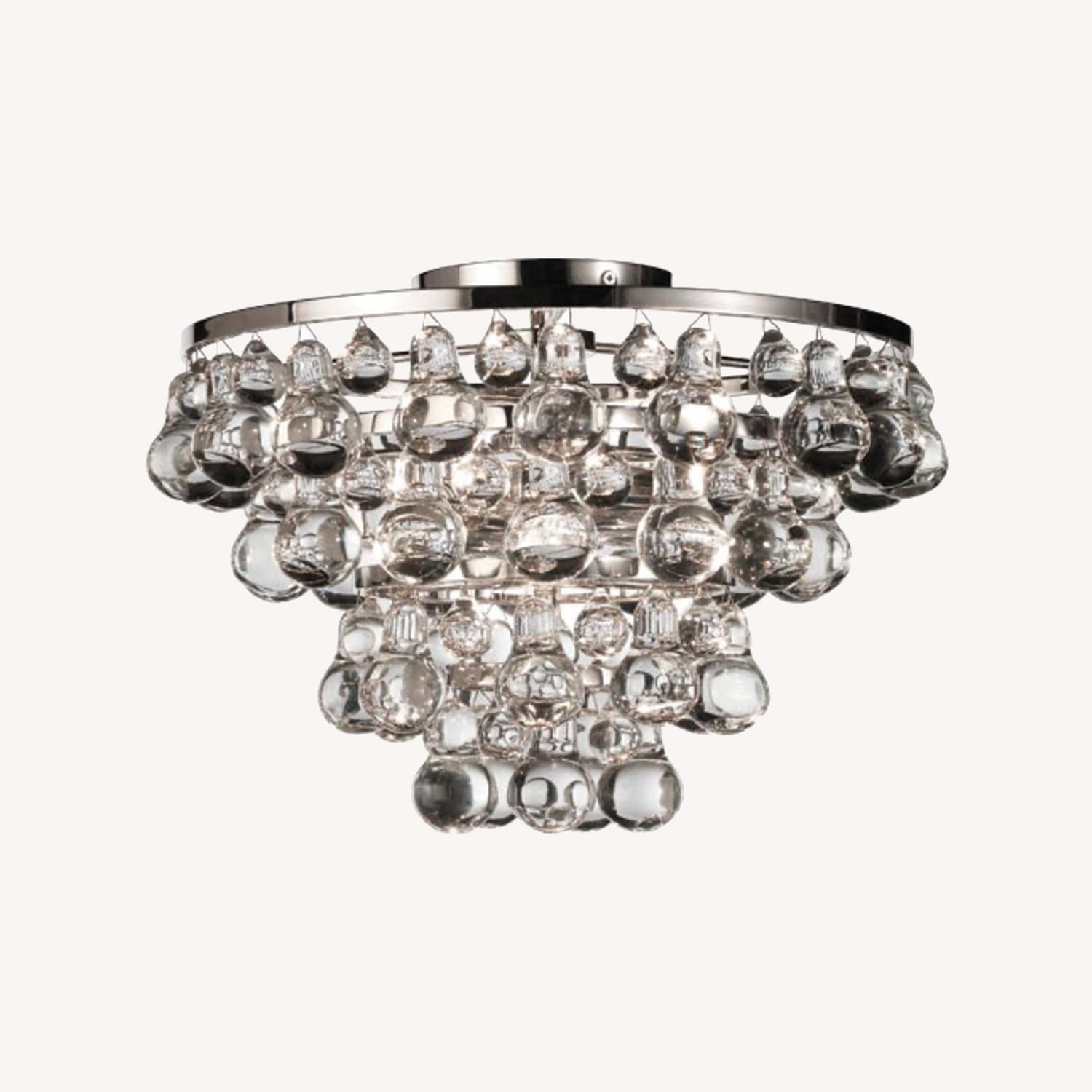 Seller's Notes:“In a brilliant polished nickel finish paired with beautiful glass droplets, this distinctive design offers plenty of shimmer and sparkle. Part of the Bling lighting collection by Robert Abbey.“ Robert Abbey “Bling” Flushmount Chandelier Finish: Polished Nickel Bulbs: 2 x 60W Max (Type: B11 Med Base Torpedo) LED Equivalent: 10 Dimensions: 12"H x 16.75"W Drop: 8.625" to 12"