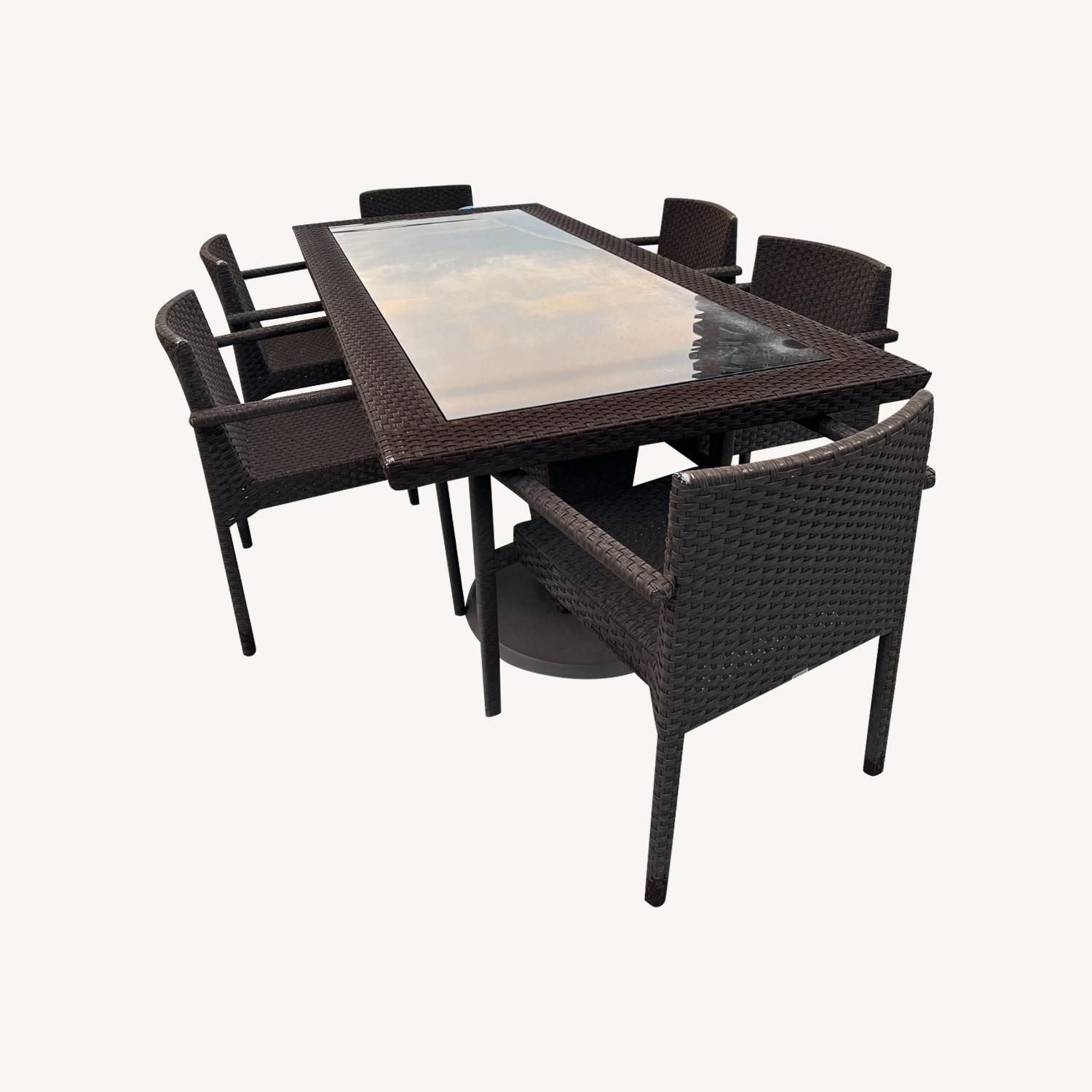 Seller's Notes:Roberti Rattan Greenfield collection uses a combination of materials composed of rattan, aluminum and polyethylene cables. Approximately 86"L x 40" W x 29"H, comes with 6 chairs. Weaved design, brown tinted glass table and chairs in good condition , corner of chairs and top rattan of table shows a bit of fading from sun but overall in good solid condition