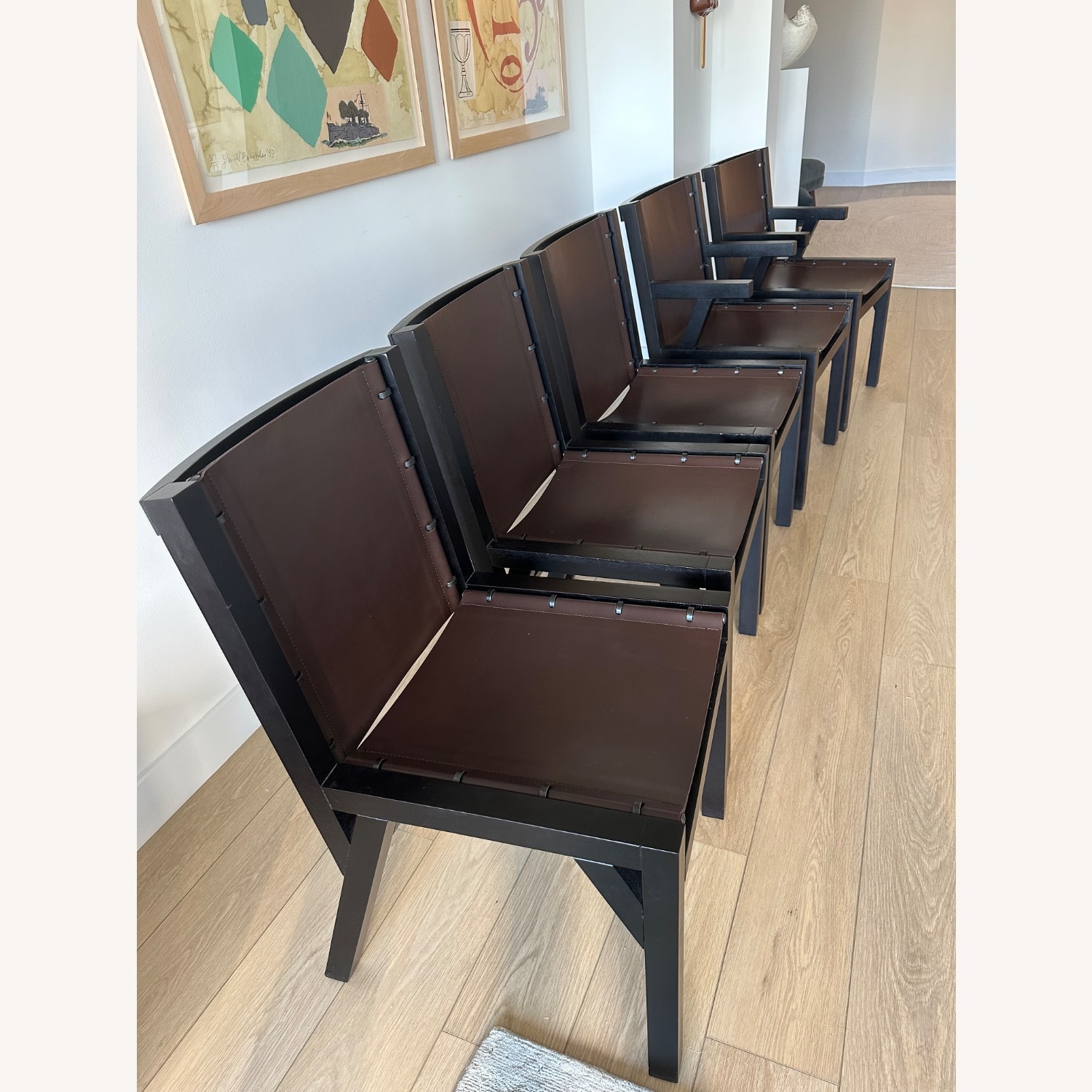 Seller's Notes:Set of 6 dining chairs are beautiful and chic. The leather is a deep brown/wine color. They are sturdy and stable.