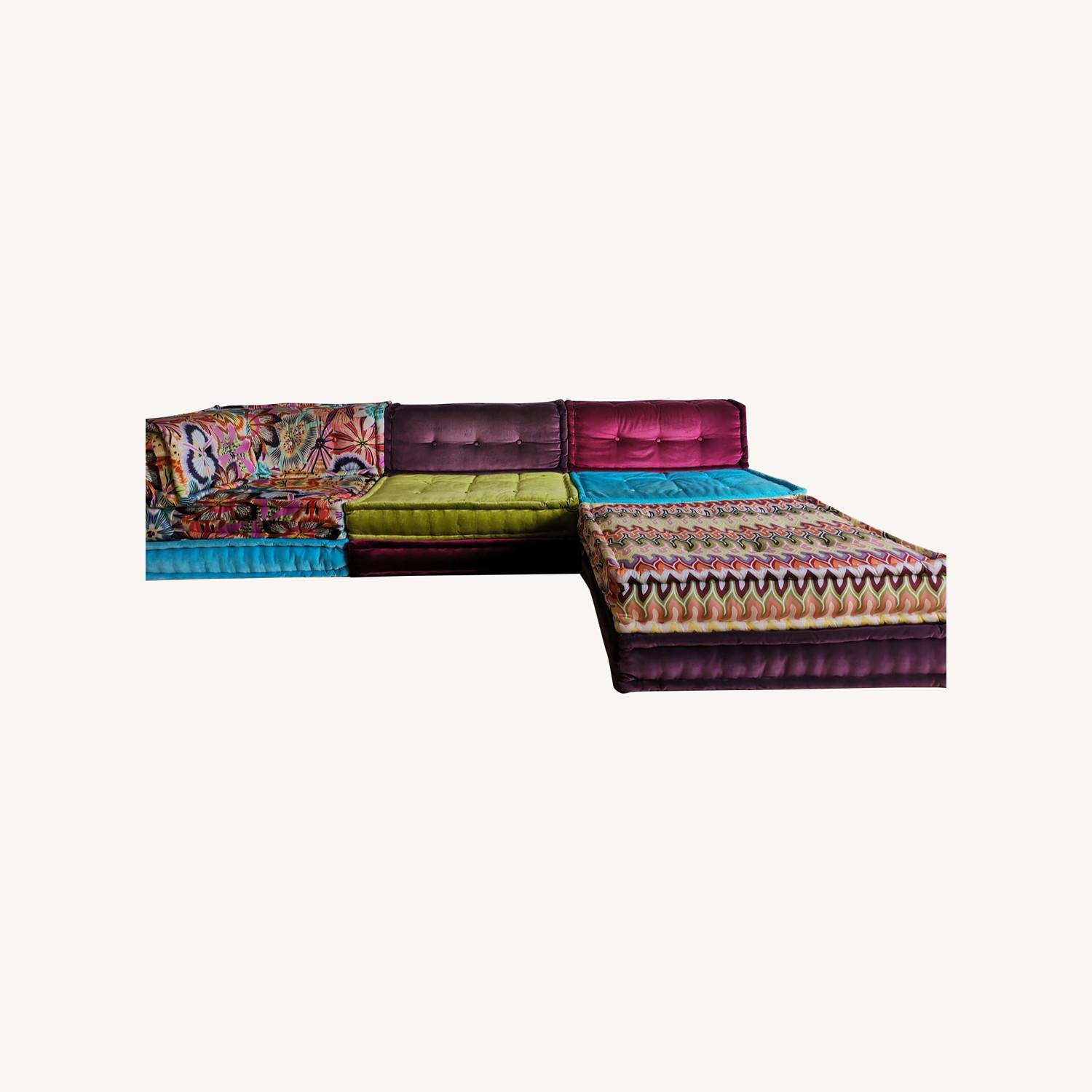 Seller's Notes:ICONIC ROCHE BOBOIS MAH JONG sofa set made in EUROPE. Modular sofa with endless possible combinations (L shape double layers or close to the ground Morocan style), fun, colourful, entertaining and a design landmark. 6 seat cushions in Designers Guild velvet Glenville: Cranberry, Blackberry, Lime, 2 Turquoise and Candy Pink 2 straight backs in Designers Guild velvet Glenville: Cranberry; Blackberry 1 seat cushion MISSONI Neda + its corner back MISSONI Neda 1 seat cushion MISSONI Naduan Retail value when brand new in store $21195