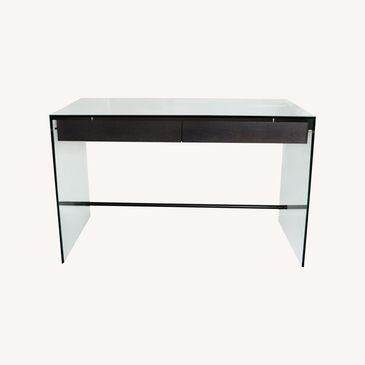 Seller's Notes:Clear glass Indo desk with simplified form, anodized metal footrest, 2 floating blackened oak-veneered drawers and brand plaque at right wall under removable top, designed by René Bouchara, manufactured by Roche Bobois.