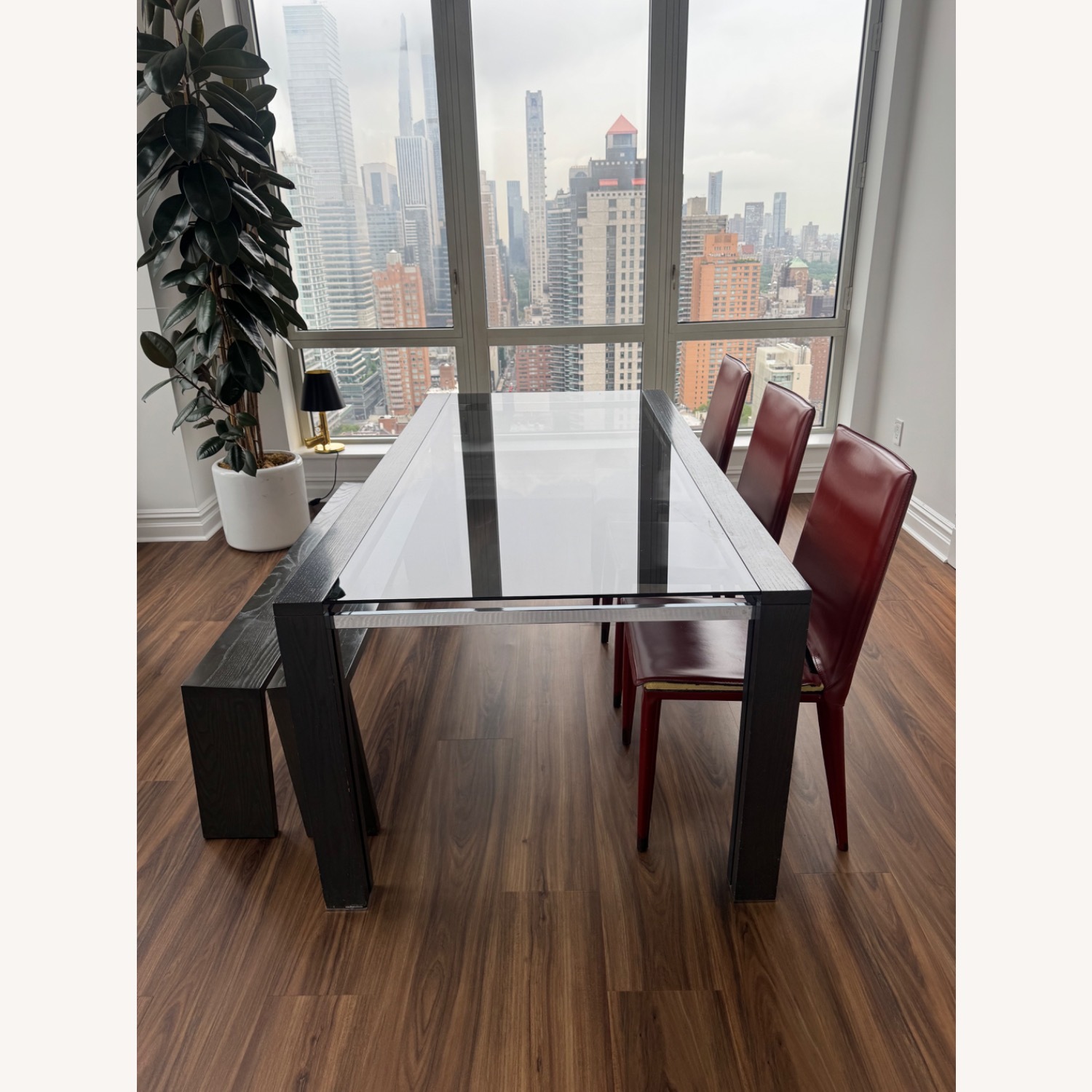 Seller's Notes:Wood and glass dining table Original Roche Bobois Roche Bobois stamp on leg Scratches but in good condition , and with a little furniture repair kit, wood will look brand new. Originally 2500$ Bench is also up for sale. Matching smoke wood bench is by Blu dot
