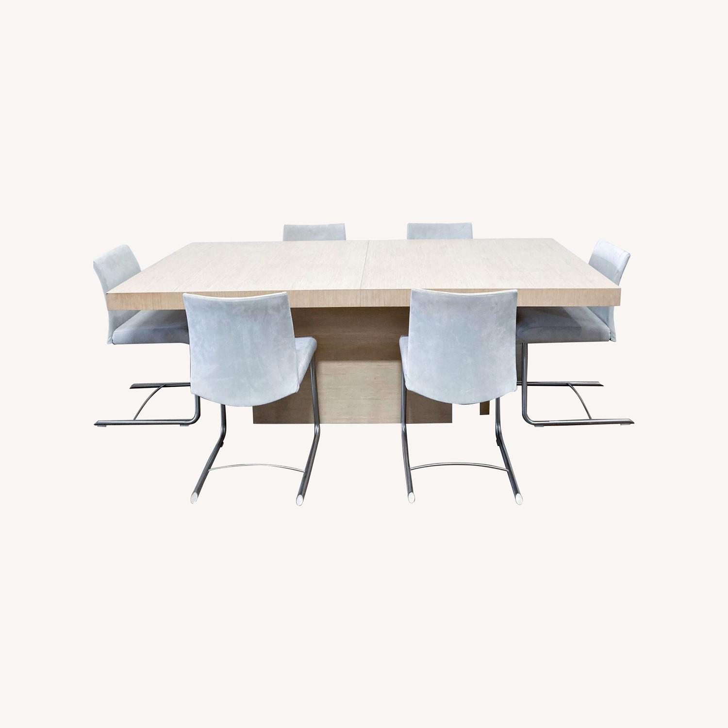 Seller's Notes:Description: This high end designer dining set from Roche Bubois features a contemporary wood dining table with a natural finish and includes an extension for seating up to 8. Six grey suede chairs have a reclining back and stainless steel legs.. Brand: Roche Bubois. Material: wood,metal. Seat heigt: 14. Gently used - any blemishes or damage will be included in the photos. #SKU: 2014583. Tags: contemporary,designer,leather,metal,wood,liquidation