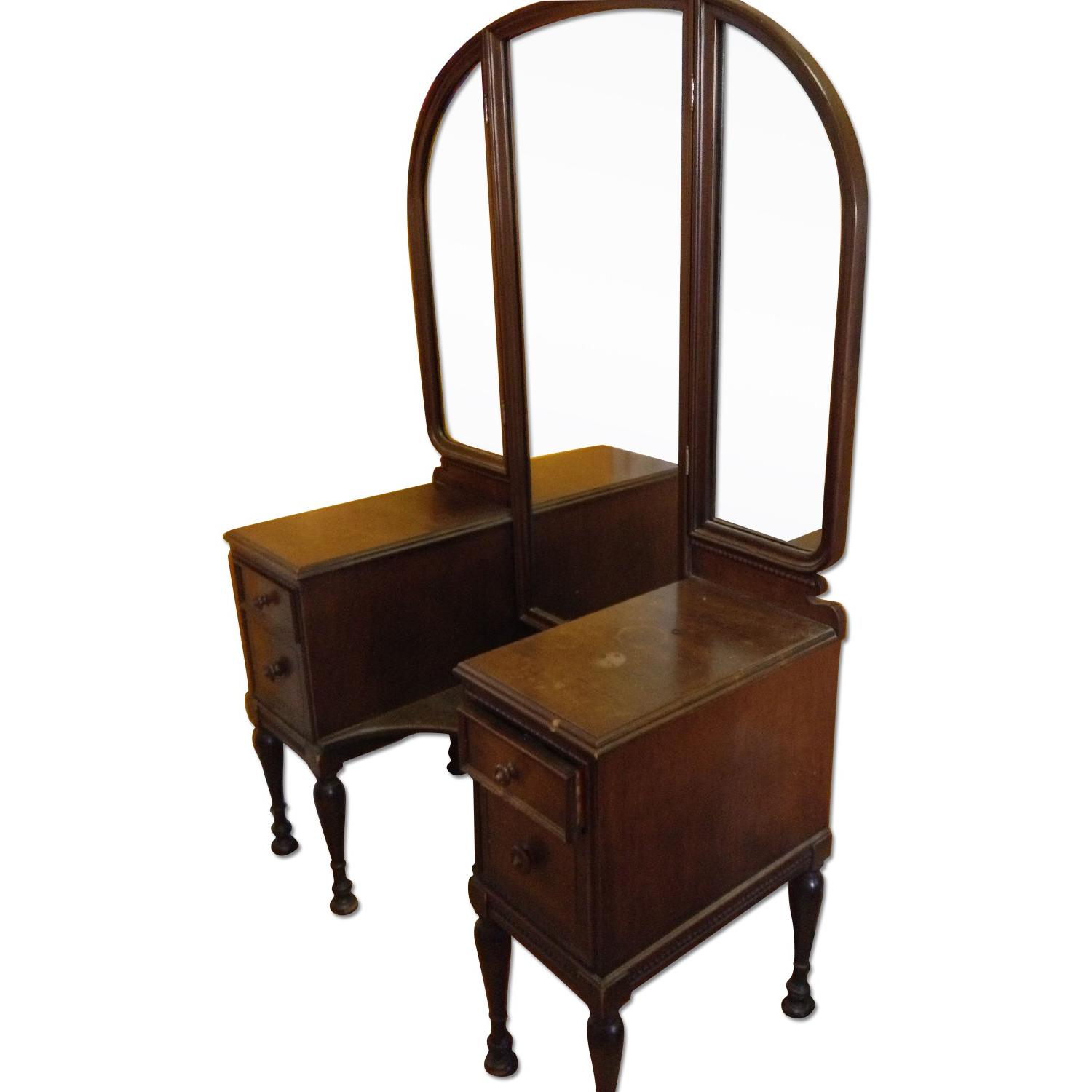 Seller's Notes:GORGEOUS, beloved all-original wood, antique mid-century vanity with 3-way mirror. It is great condition (very minor scratches for an 80 y/o furniture piece!) and has only had three owners in over 80 years. Unique, old-school vanity styling and construction. Beautiful detailing and fixtures. One inlaid shelf and plenty of drawers and dresser space.