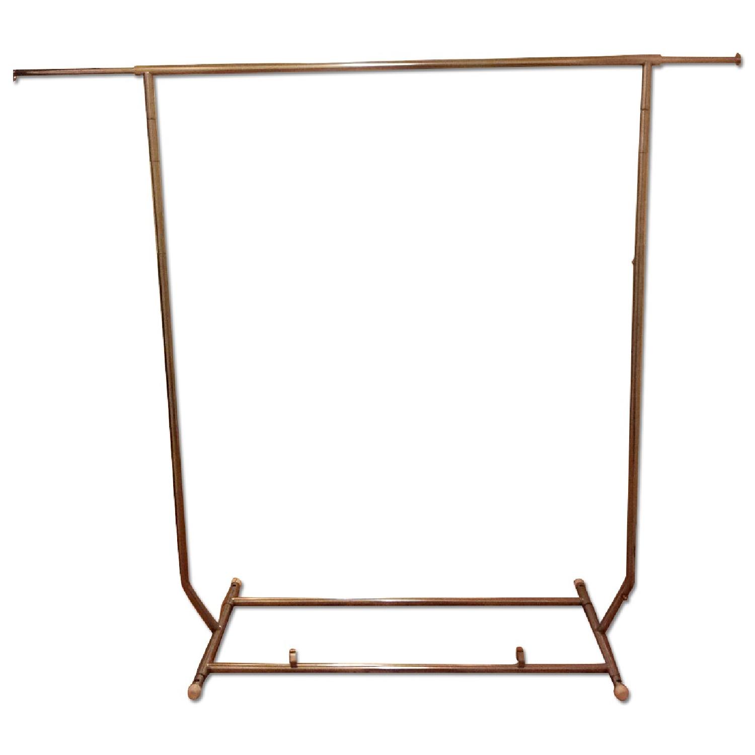 Seller's Notes:Commercial grade, chrome finish garment rack, on wheels and collapses to fit under your bed or in a closet. Transports easily in a taxi! (If using AptDeco's flat rate delivery, please note that the item is over 15 LBs.) Purchased from a fashion showroom supply store in Boston. Chic looking as a "closet" in your NY apartment, and more versatile than an armoire or dresser. (The plastic cap on one of the legs is cracked - see pic.) WIDTH: 74"W with extensions opened and 50 1/4"W with extensions closed. DEPTH: 22"D HEIGHT: 65"H with wheels and 60 5/8"H without. (Height adjusts to 2 lower heights.)