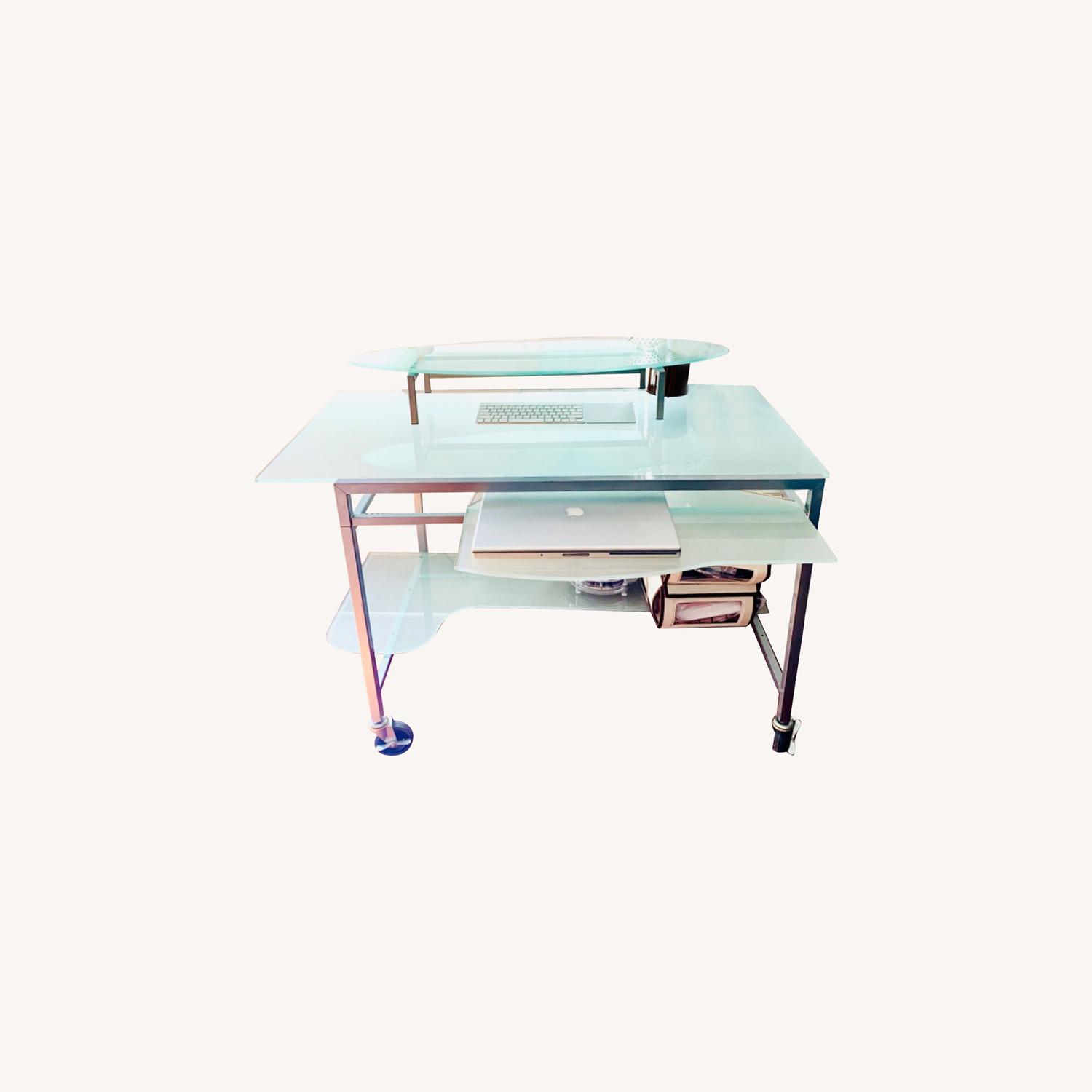 Seller's Notes:MOVING SALE! The perfect sleek work desk that is airy and light in any room. Glass gives the illusion that it is smaller in a room. Good quality/sturdy designer desk. Pull out shelf for laptop or keyboard. Top shelf can be removed (lifts off). Slightly frosted glass with a metal satin finish silver frame. On rollers so can be moved easily or locked in place. Still looks like new after many years! 3 matching shelves listed on the site as well.