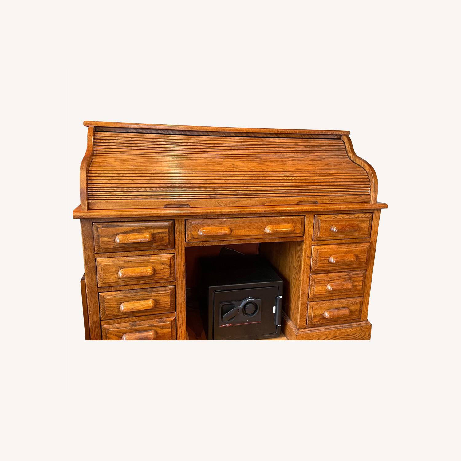 Seller's Notes:Solid wood roll top desk in great condition. Features deep well joined drawers and a built in light.