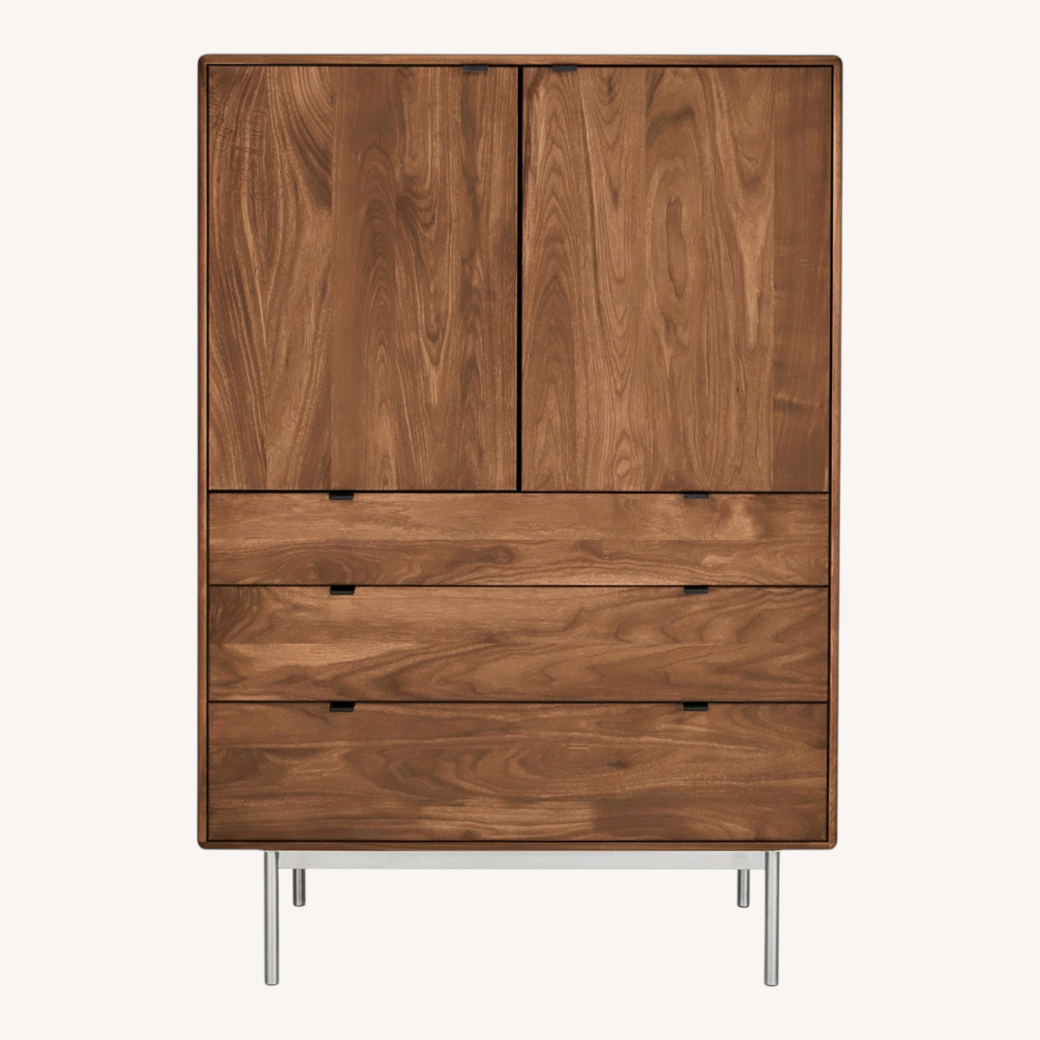Seller's Notes:Our Hensley armoire brings a soft and modern silhouette to your bedroom. Inspired by the timeless appeal of mid-century design and infused with modern details, Hensley features a stunning mix of materials that give it an updated look for today. You'll love the smooth feel of the domestically sourced solid wood, and appreciate the durability and beauty of the brushed stainless steel or powder-coated graphite base. Softly curved door and drawer pulls mimic the rounded edges of the armoire to round out this sophisticated storage option.