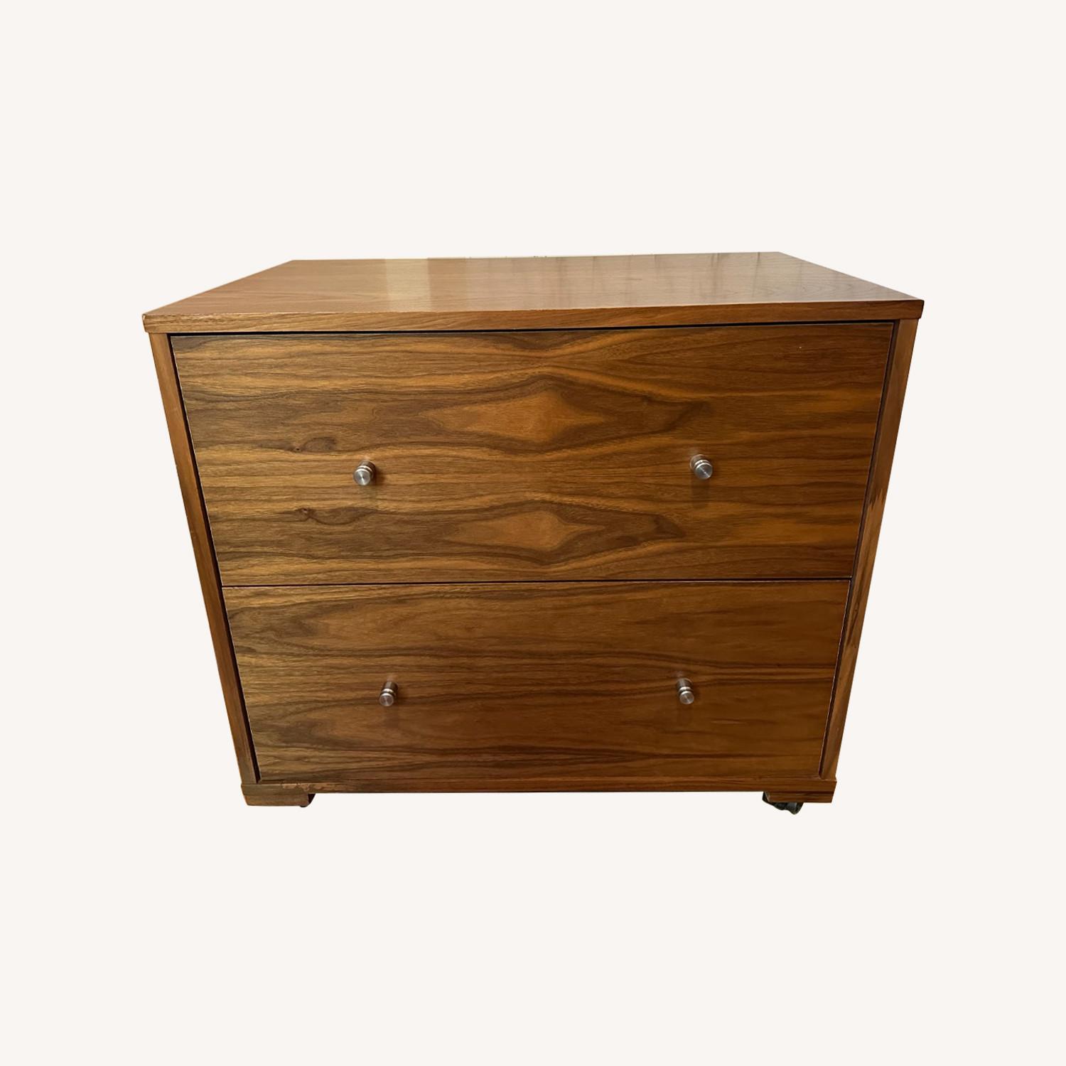 Seller's Notes:I purchased this file cabinet directly from Room & Board approx. 10 years ago. Similar to the Hudson or Sequel current models from R&B, 30' wide though. It's still in great shape for it's age. All hardware works perfectly, drawers slide smoothly and wheels are in good shape. It's heavy and made of solid wood w/ walnut veneer. Veneer blemish on the bottom left corner, 2 minor veneer chips on the backside (top right & bottom left corners), 1 very small corner dent on the front left as seen in the photo.