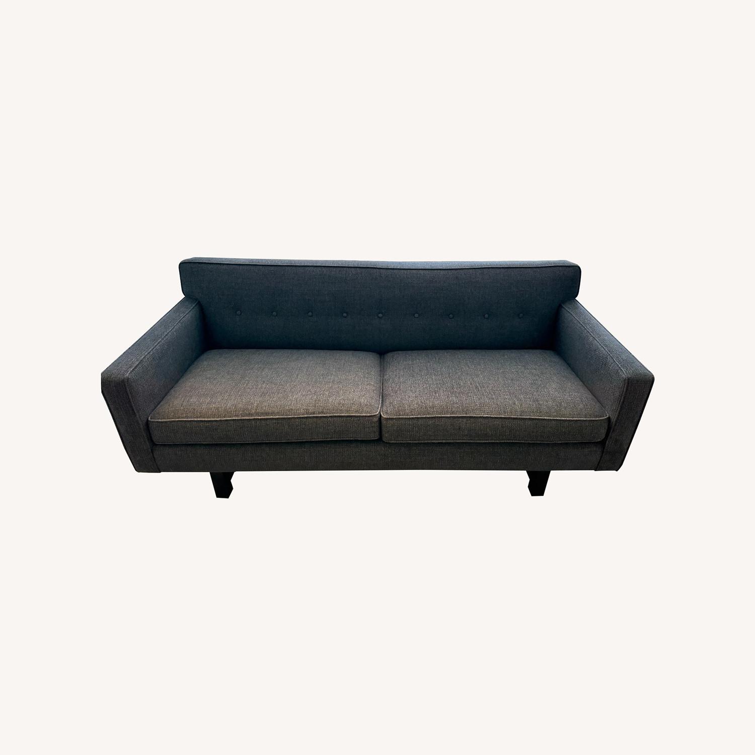 Seller's Notes:Downsizing and moving at end of month so this is priced to go! This comfortable, apartment-friendly 76" long 2-cushion sofa can seat up to 3 people and was purchased in 2019 from Room & Board. It is part of their Andre collection in "Total Ink" color which is dark blue with gray undertones, legs are a dark charcoal stain. Retail is $2099, this exact variant is not currently on the Room & Board site.