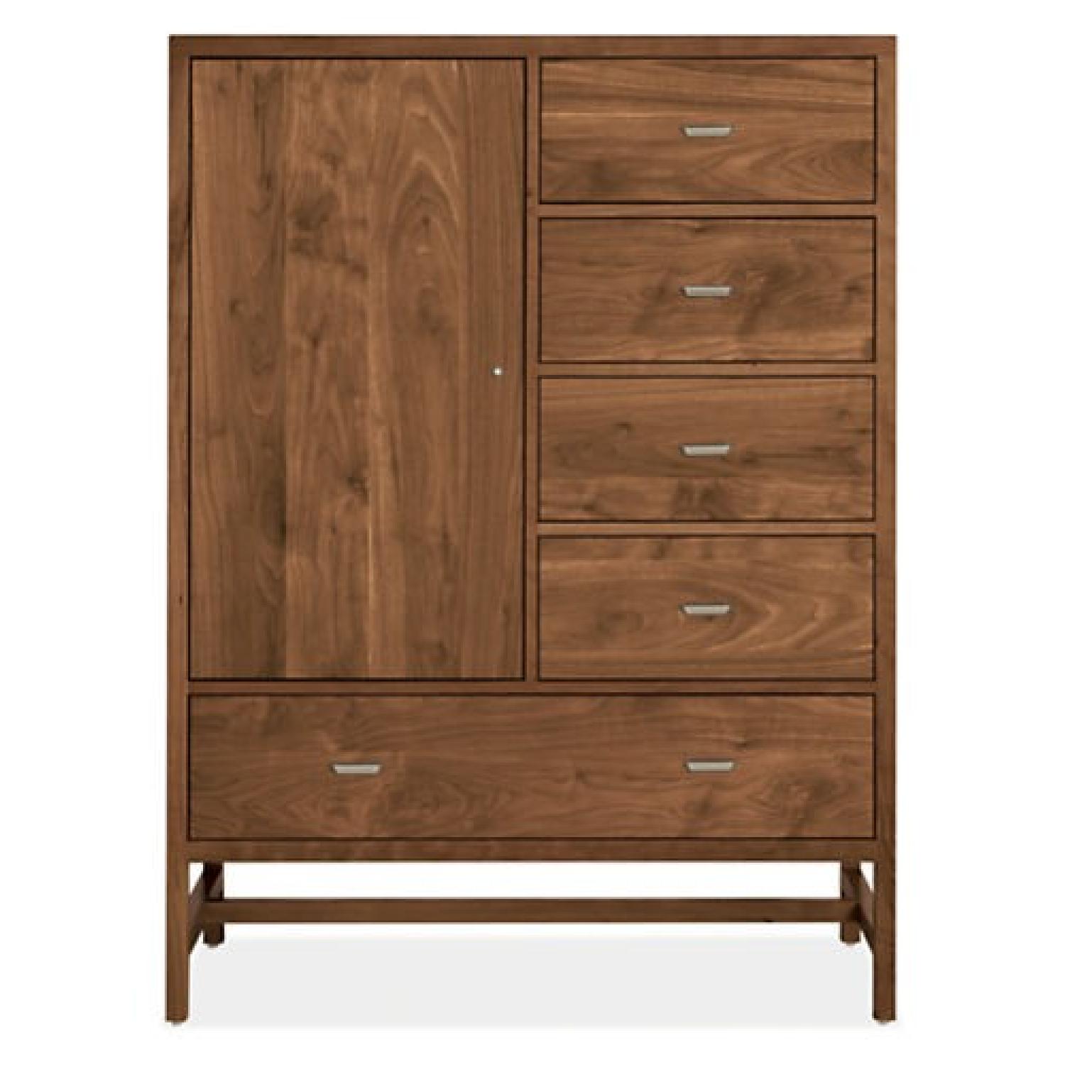 Seller's Notes:Inspired by Asian design details with a modern edge, the form of our Berkeley collection gracefully bridges classic and contemporary styles. A unique solid wood base, flush sides and distinctive slab pulls are elegant details you'll enjoy every day. Handcrafted by North Dakota woodworkers from solid wood and expertly constructed solid wood veneer, this collection is meant to be an enduring part of your home. Dimensions: 42"w 20"d 56"h Floor to Bottom Clearance: 3"h Space Between Legs: 39.5"w 17.5"d Leg Thickness: 1.25"w Drawer Construction: solid wood front; Baltic birch plywood sides; dovetail joinery; wood veneer bottom Drawer Details: full-extension ball-bearing glides; lacquered interior; 100-lb capacity Drawer Interior: (4) 17.25"w 17"d 6"h; (1) 37.25"w 17"d 6"h Door Construction: solid wood Door Details: fully adjustable hinges Space Behind Doors: (1) 19.25"w 18.5"d 35.25"h Shelves: two adjustable wood; one fixed wood Includes: anti-tip safety hardware Certification: meets voluntary ASTM F2057-14 anti-tip safety standard for clothing storage units over 30" high See more Product Origin: made in North Dakota Material Origin: United States and imported Wood: walnut See full material details Finish: lacquer Material Description: Walnut adds timeless depth and character to your room. Even after walnut is harvested and made into furniture, it continues to be a living, breathing material that responds to its environment - it expands and contracts with changes in humidity and also changes color over time as it's exposed to air, sunlight and wear. New walnut starts as a dark chocolate brown and beautifully ages to lighter brown or honey color over time. Hardware: nickel Finish: brushed