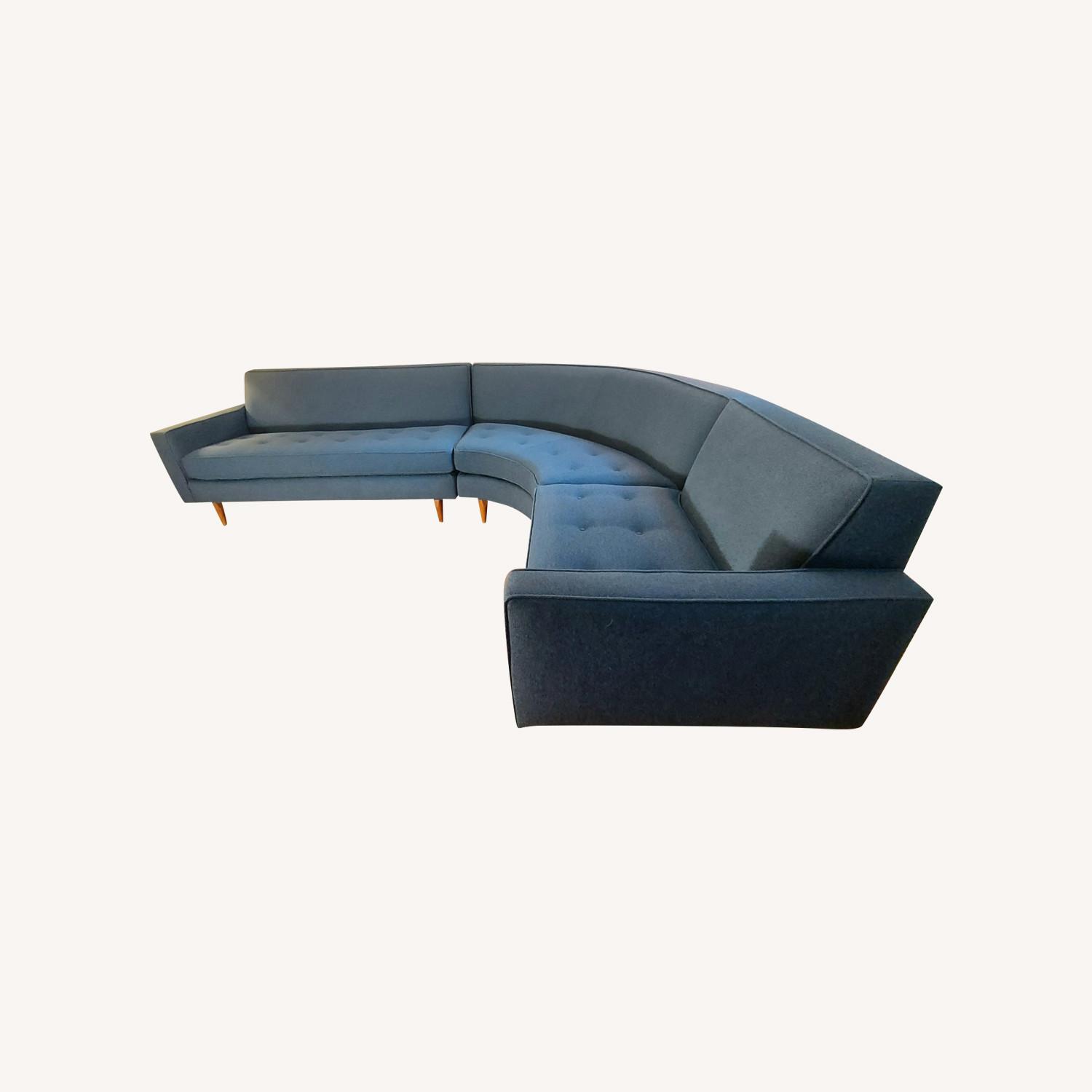 Seller's Notes:3 piece: Sofa section, large curve, armchair. 115” Long x 87” Deep x 31” High A small-scale sectional with sophisticated style, Reese adds refinement with details like button tufting, precise welting and tall, tapered legs. The shallow seat features structured cushions for supportive, upright sitting for people of all sizes. This sofa is in very good condition with all new seat cushions for each section. Gentle wear on the sofa arms. In a textured boucle weave in rich Tatum Blue.