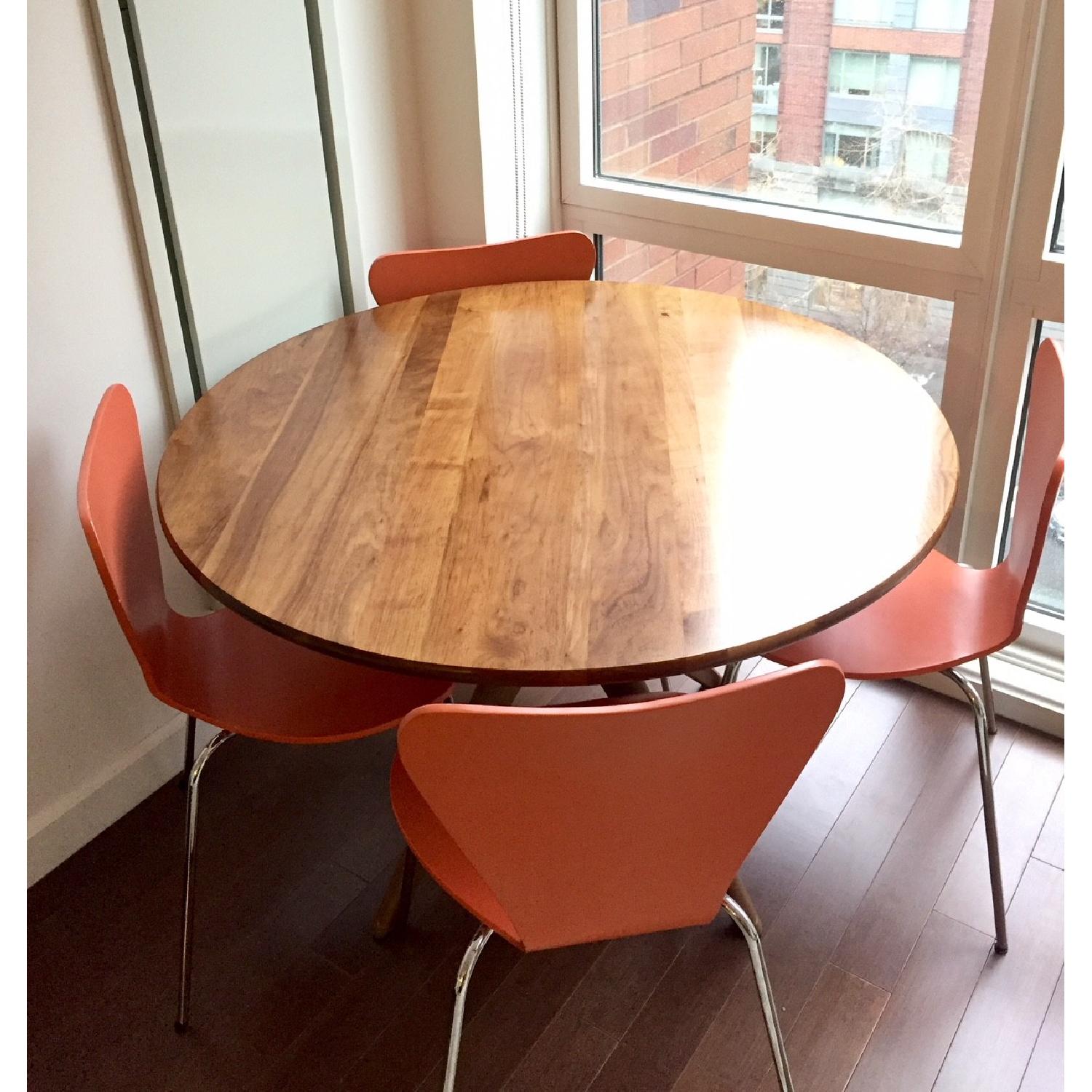 Seller's Notes:Barely used Room and Board Table and Chairs available! This gorgeous Bradshaw table made from solid American walnut wood measures 45" in diameter and 29" height. Its accompanied by 4 Pike chairs: * Dimensions: 23"w 21"d 34"h * Seat Height: 18"h Drawing from Danish and mid-century influences, the top and base of the Bradshaw dining table is finished with a rounded bull-nose edge that enhances the fluid, organic profile of this solid wood piece. This timeless piece will look fabulous in your condo, breakfast nook, or dining room. Table is in like new condition, there are very light signs of wear on a couple chairs. This is all cosmetic(paint) and measures no larger than a pea. You'd have to stare to find it. Apartment Therapy highly recommended this table when it was in circulation..see: https://www.apartmenttherapy.com/a-table-like-this-good-questio-99480 Original price of table: $1,999.00 Pike Chairs: $129.00 each