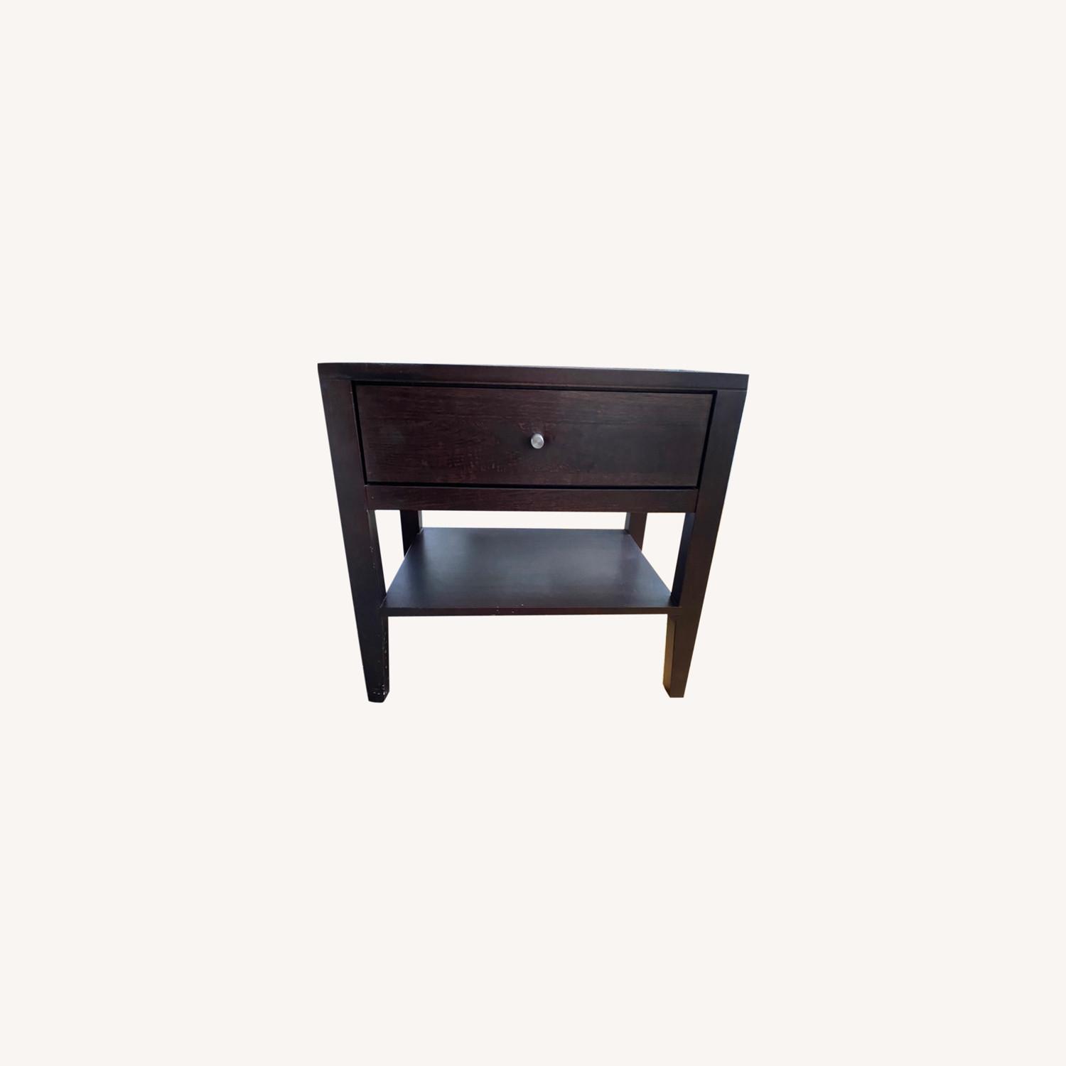 Seller's Notes:One-drawer nightstands in Mocha stain with tapered leg and stainless steel hardware. Color is a lovely dark reddish/brown that shows off the wood grain. Drawer opens smoothly; some stains that could be made less noticeable with good wood polish.