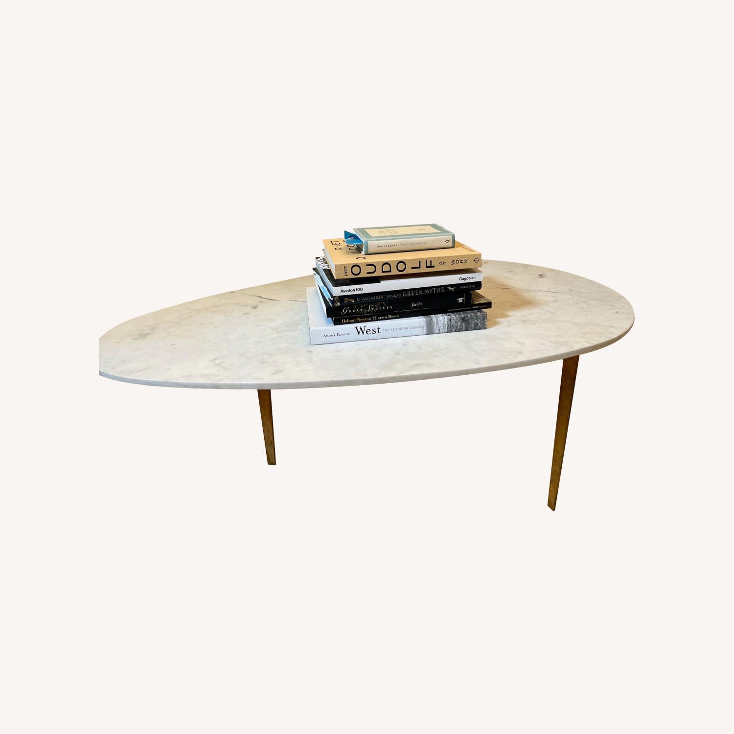 Seller's Notes:This beautiful egg-shaped coffee table is made of a white marble top, with sturdy gold leaf legs. Table is in excellent condition with no signs of wear. The table is made of two pieces--the top can be lifted off the legs to make transportation easier. TU