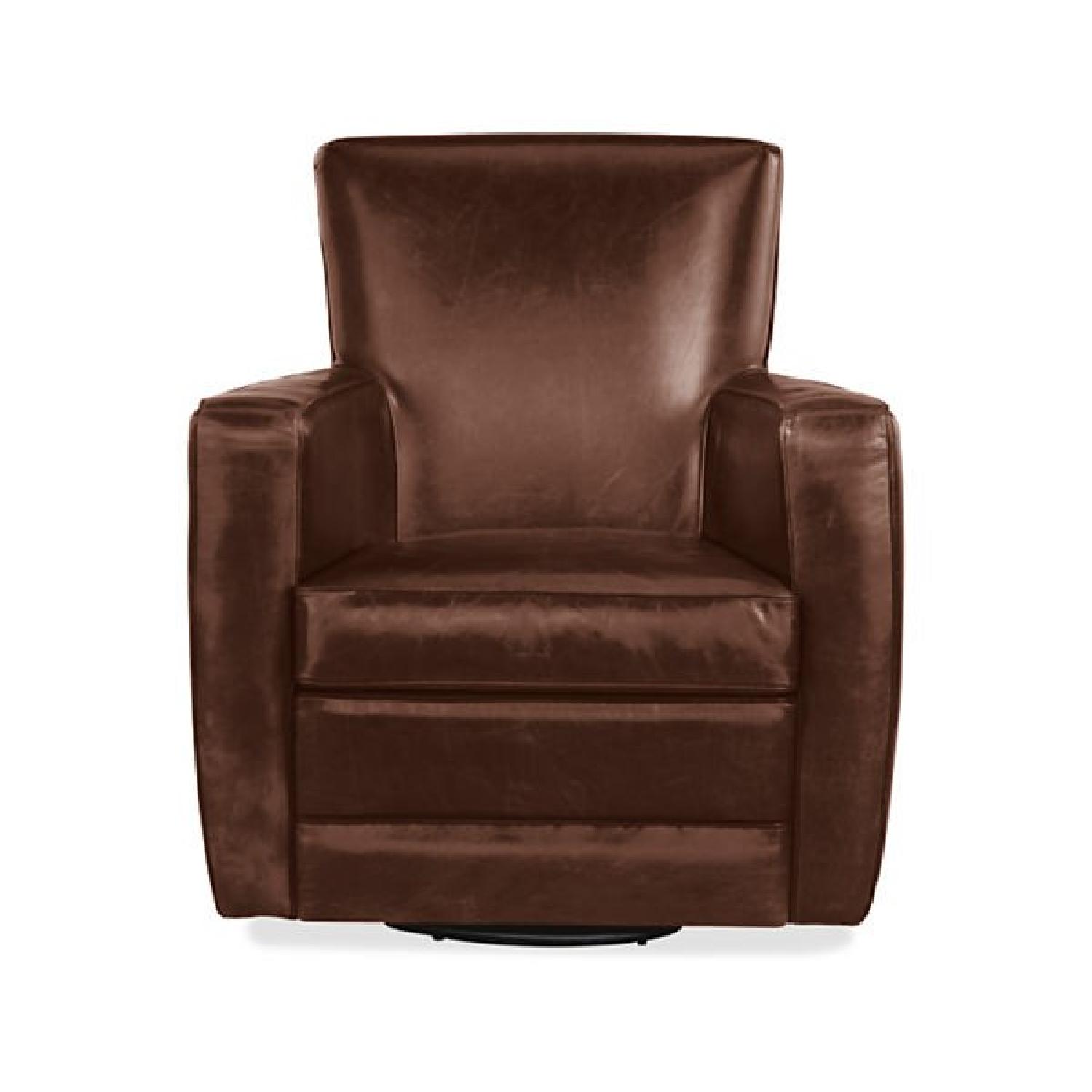 Seller's Notes:Chocolate leather swivel armchair, perfect for office or living room. Bought four years ago but now changing aesthetic and want to replace furniture. Extremely comfortable. Discoloration (i.e. darkened leather) on seat and arm of chair.