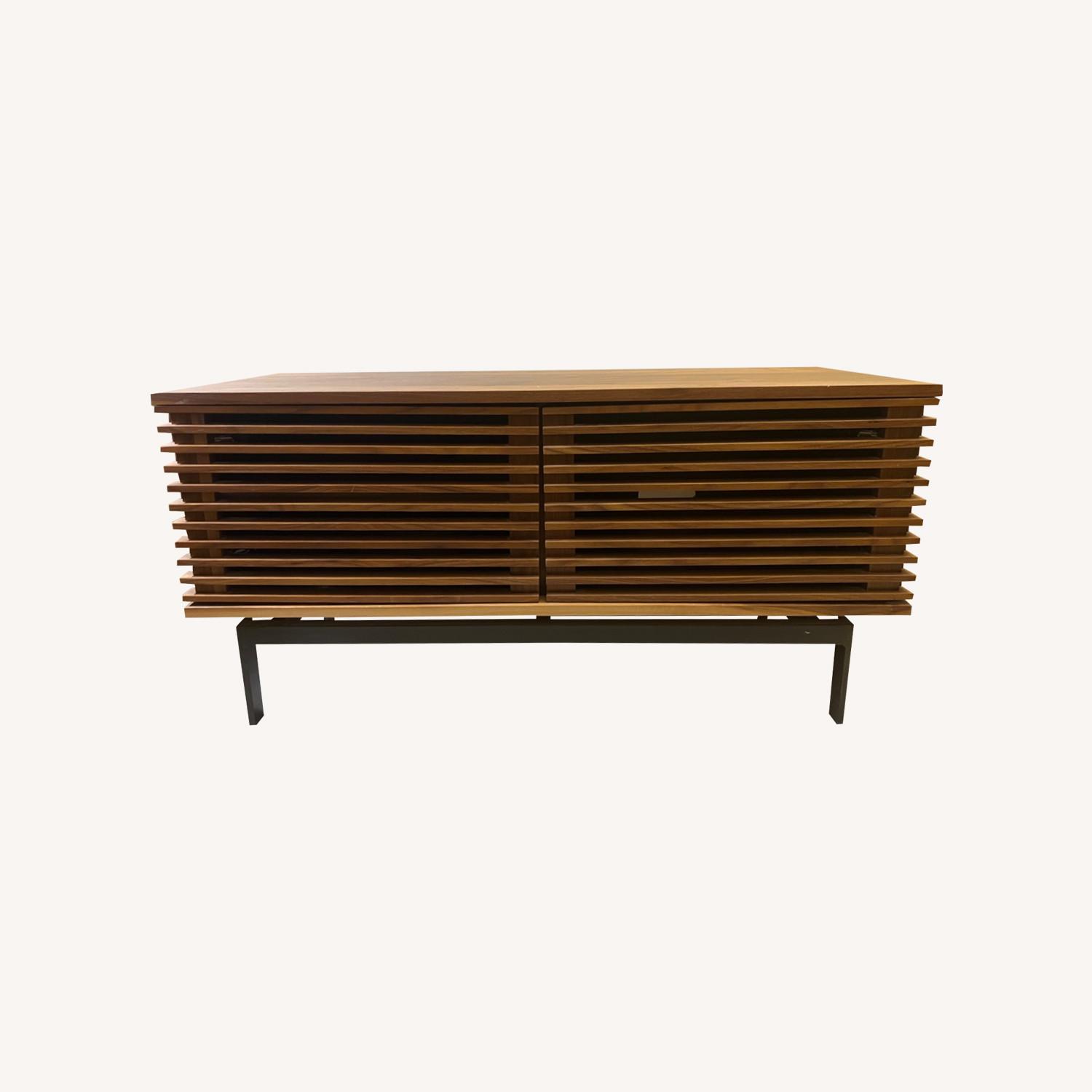 Seller's Notes:Almost like new Room & Board Coles media cabinet in walnut with a dark steel base. “Used”for 2 years and then in storage during renovations. Too small for my living room, too large for my guest room