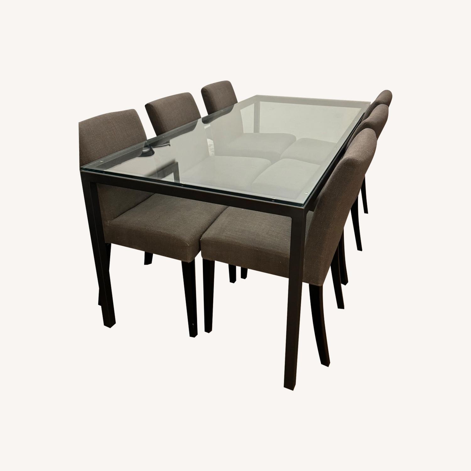 Seller's Notes:Room & Board custom Parsons Dining Table with 2” natural steel base and satin etched glass top. 74” W x 34” D x 29” H. Six Crate and Barrel Lowe Chairs (Color: Smoke) may be added for an additional $350 (originally $1319). Table and chairs in good condition. Minor surface scratches on glass top- visible in photo.