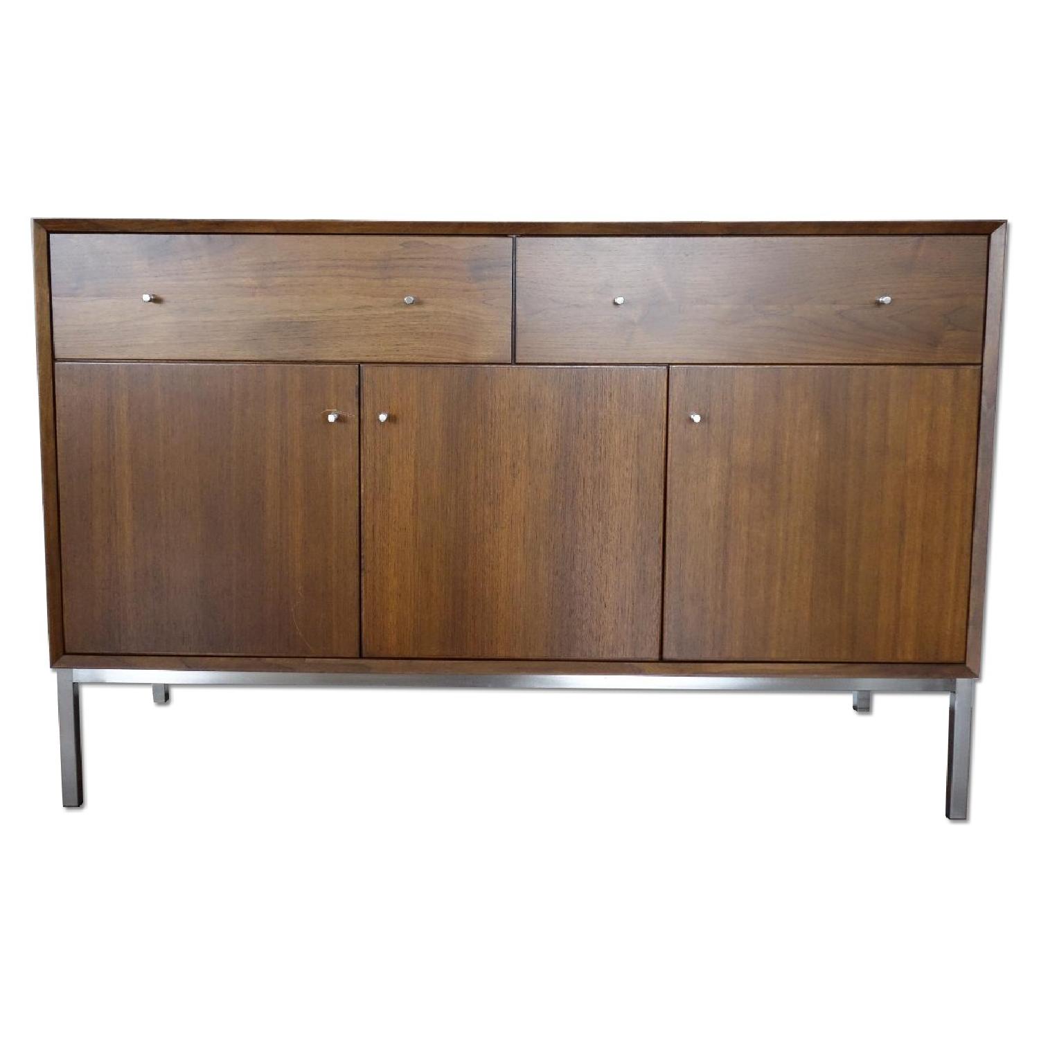 Seller's Notes:Room and Board walnut Delano cabinet with stainless steel legs. Made in Wisconsin. Elegant, clean, mid-century design. Great storage. Minor scratches on the front left door (right corner and near the knob) which could easily be buffed out. This is a beautiful functional piece. Space behind doors: (1) 35.75"w 18.5"d 17.5"h; (1) 17.75"w 18.5"d 17.5"h. Drawer Interior: (2) 24.75"w 17"d 6"h.