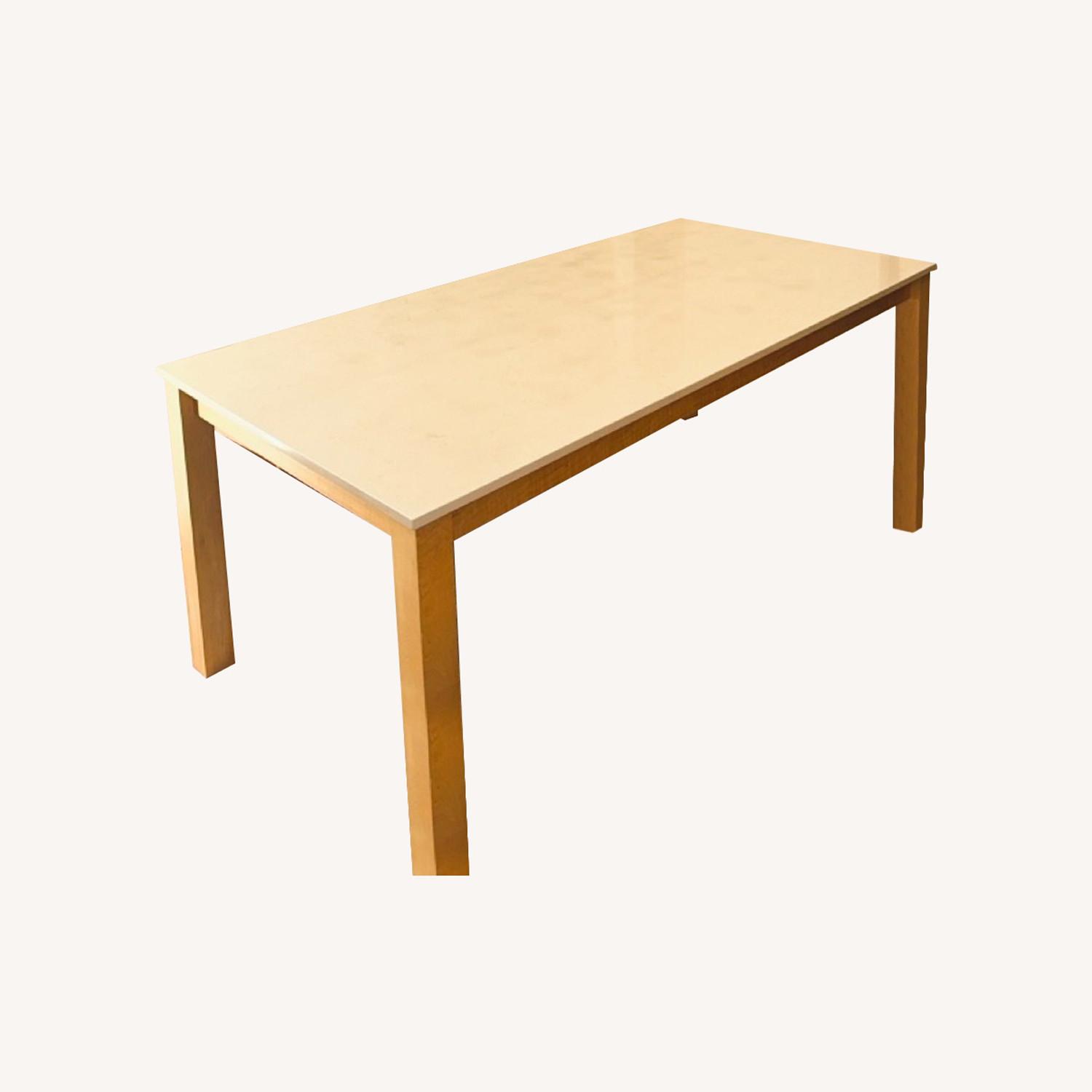 Seller's Notes:Step into a world where classic design meets contemporary charm with our Room & Board Linden Dining Table. Crafted with precision, this table features a robust maple base and a luxurious fawn quartz top, offering a blend of durability and timeless elegance. Measuring 72 inches wide and 36 inches deep, it provides ample space for family dinners, casual brunches, or intimate gatherings. The table stands at a comfortable height of 29 inches, with a sleek 2.75-inch apron and about 25.25 inches from apron to floor, ensuring plenty of legroom. The generous space between the legs (66"w x 30"d) accommodates multiple chairs, making it an ideal centerpiece for your dining area. In excellent condition, this Linden table promises not only style but also a legacy of quality and comfort. Whether you're hosting a lively party or enjoying a quiet meal, it brings both functionality and a touch of sophistication to your home. Don't miss out on the opportunity to own a piece that blends seamlessly with any décor, enhancing your living space with its understated elegance