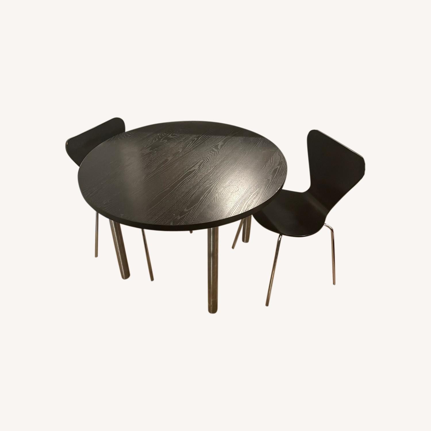 Seller's Notes:42" round ebony top dining table with pair of stanton 2" round legs in stainless steel. Also included are two Jake Chairs in Black. All are sturdy and not wobbly. Can also work as a desk too!