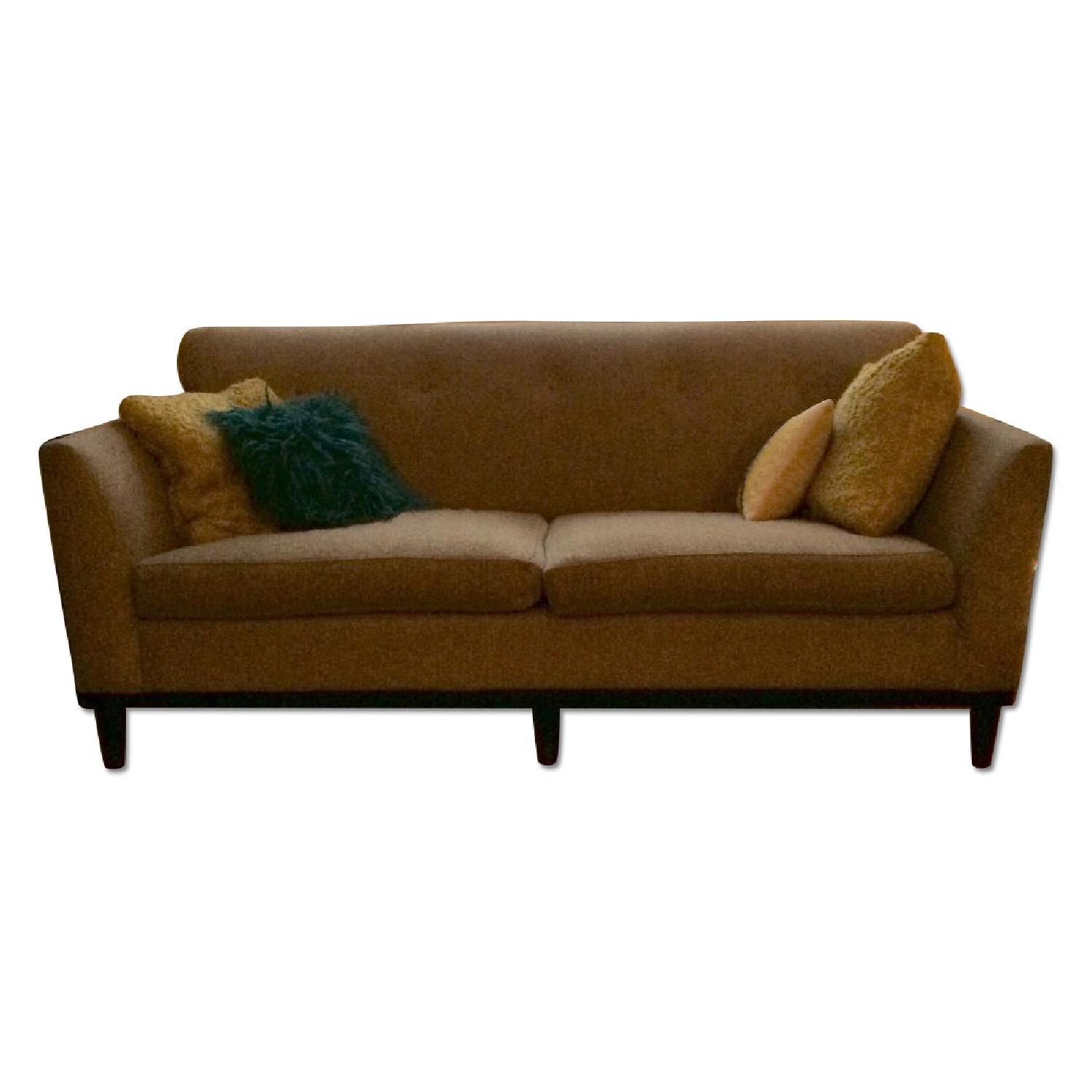 Seller's Notes:A lovely apartment sized retro modern sofa. Upholstery is polyester micro-boucle "Dita Sky" (swatch pictured); appears a neutral color at a distance with gold and blue threads on closer inspection. We bought Eugene in 2009 and would love him for years to come, but we have more space now and opted for something that seats more people. Decorative pillows and cookies not included. See photos of small spots and sofa back darkening that was exposed to New York fresh air for a few years. Wooden legs unscrew for easy transport. Seat height 16.5" Arm height 24.5" Leg height 6" Single cushion width 30" Cushion depth 24"