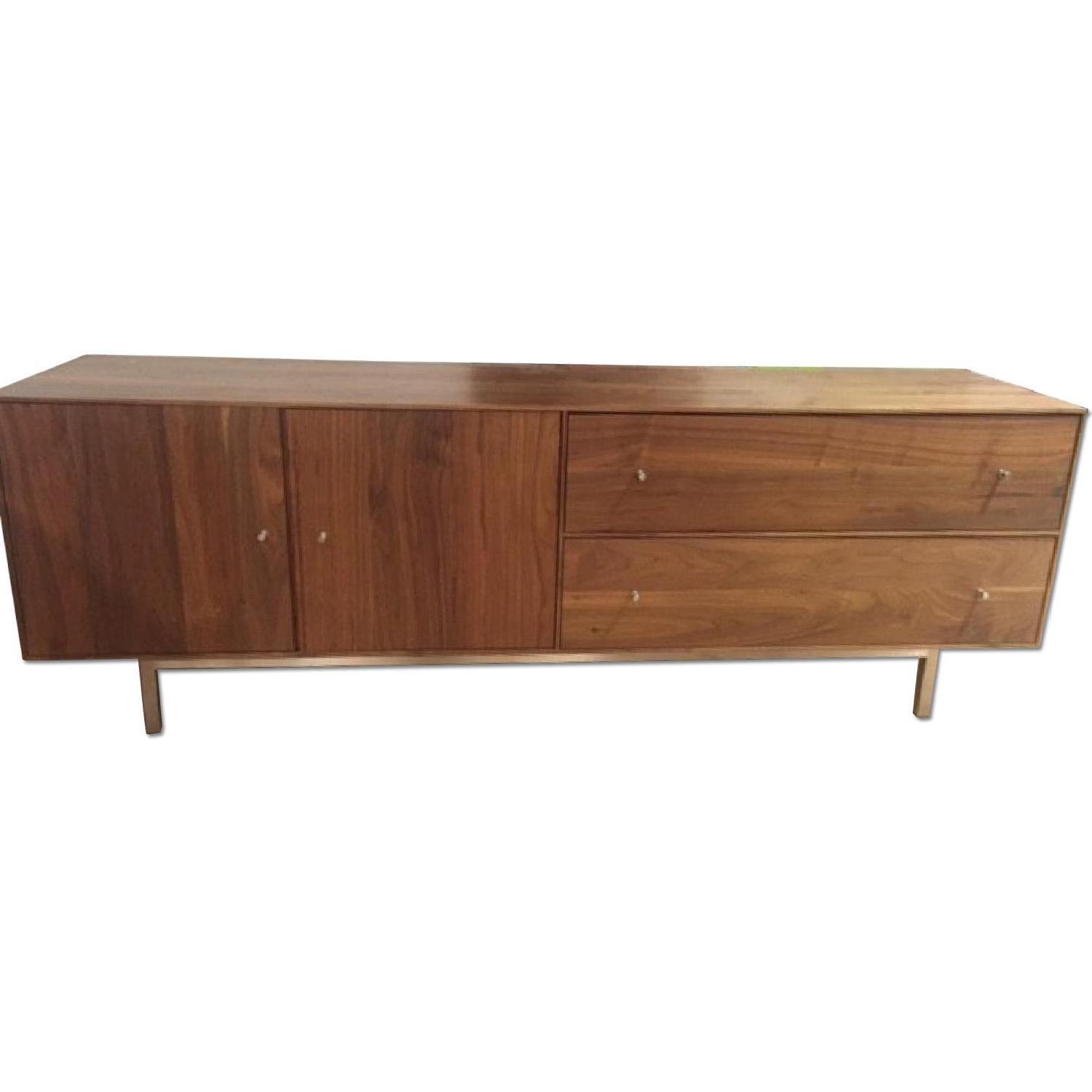 Seller's Notes:A beautiful Room & Board media cabinet from the Hudson collection. In Walnut wood with stainless steel base and hardware. Purchased 1 year ago and has not been moved since it was brought in by Room and Board delivery service. Changing our decor and sorry to see it go.