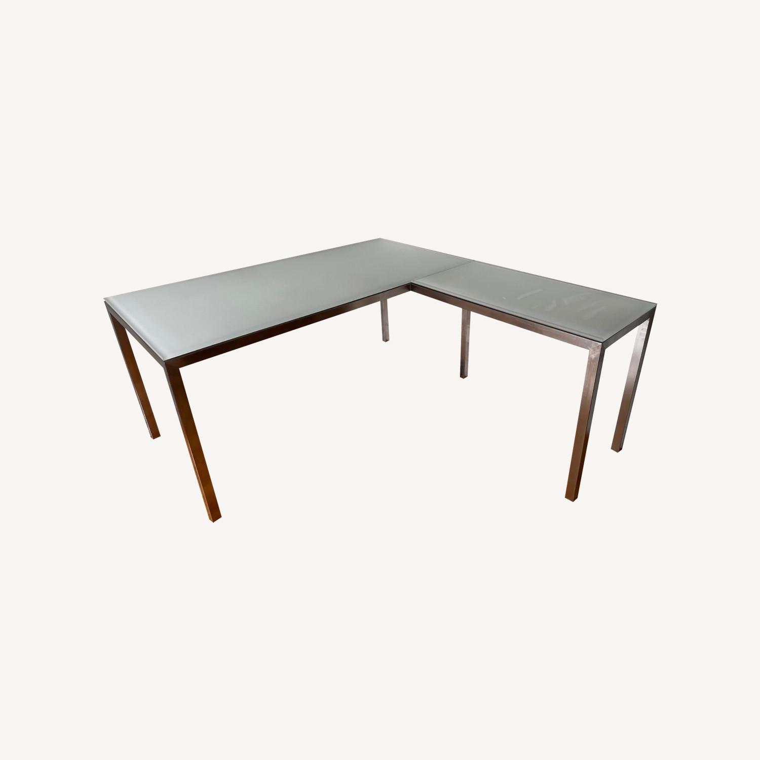 Seller's Notes:Room & Board “Portica L-shaped Desk 60w 30d 29h with 36w 18d return Top:White tempered glass Item no: 852205