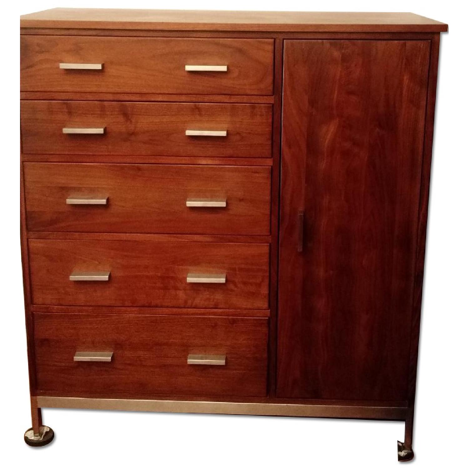 Seller's Notes:Gorgeous Room and Board Linear collection walnut wood dresser with Stainless steel base and pulls. American made, to order with REAL wood. Right side shelves are great for sweaters, tee shirts and other folded items. Top of dresser has one nick, that is barely noticeable. Inside the shelves there are some scratches to the interior of the door. Great looking, functional, well built piece.