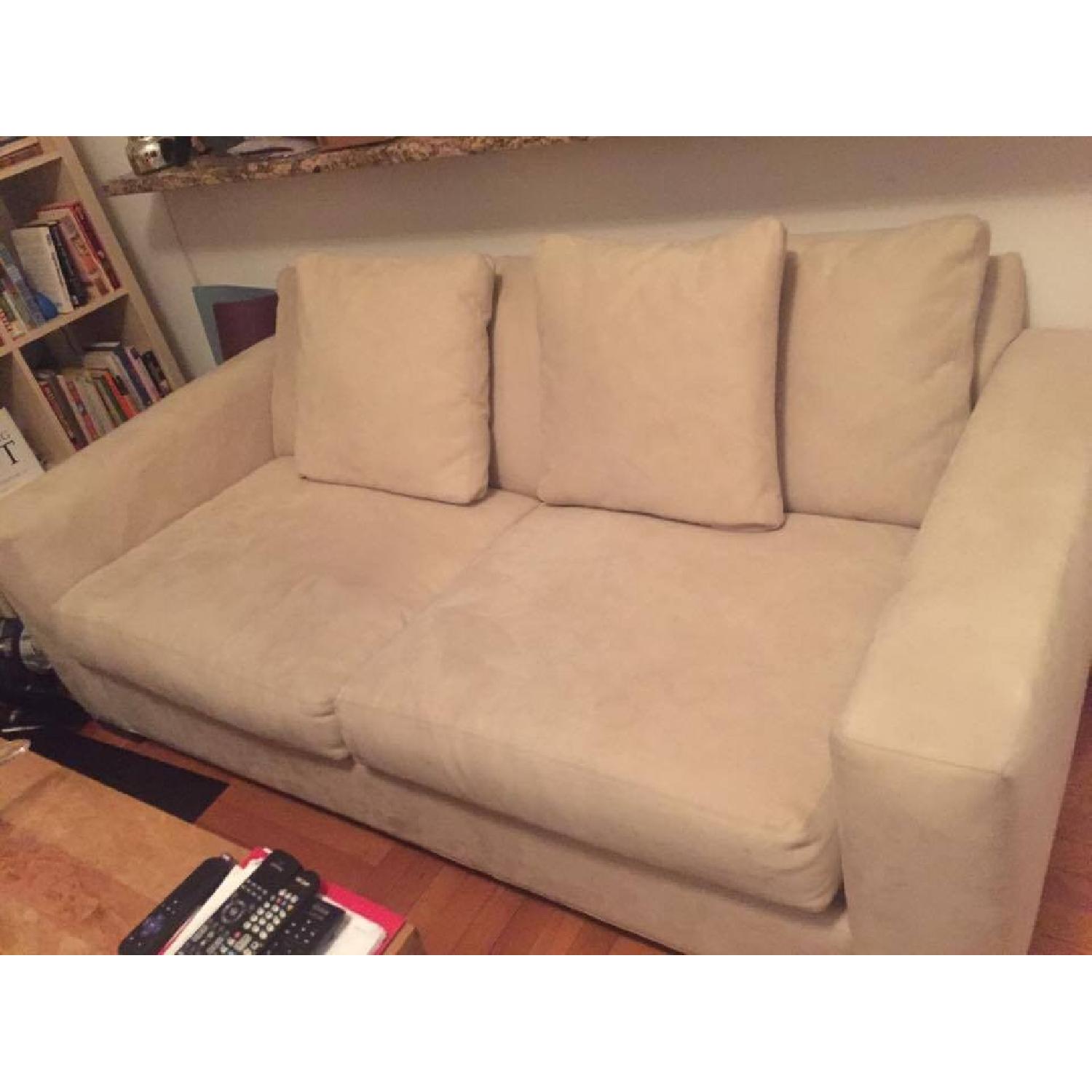 Seller's Notes:The most comfortable couch I've ever owned. Delmont microfiber fabric with Scotchgard treatment. Down filling and deep seats makes it extra cushy. Perfect as a loveseat or sofa for a small space. Ultra soft, microsuede fabric feels like real suede. I've spilled red wine and other liquids and just take a wet towel to blot it up and it's gone! There are a few small stains that are easily hidden (as shown in pics) by flipping the cushions/pillows to the other side.