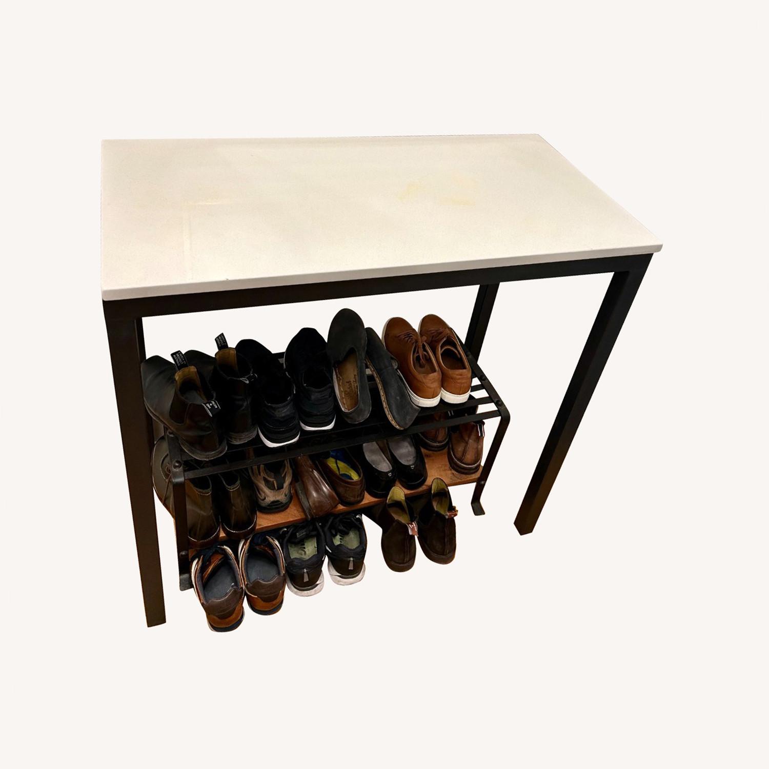 Seller's Notes:Modern parsons countertable with black steel base and white quartz countertop. Can be used either as entry table or as small dining table (fits stools perfectly). The quartz has a beige discoloration on it, but no significant scratches or signs of tear.