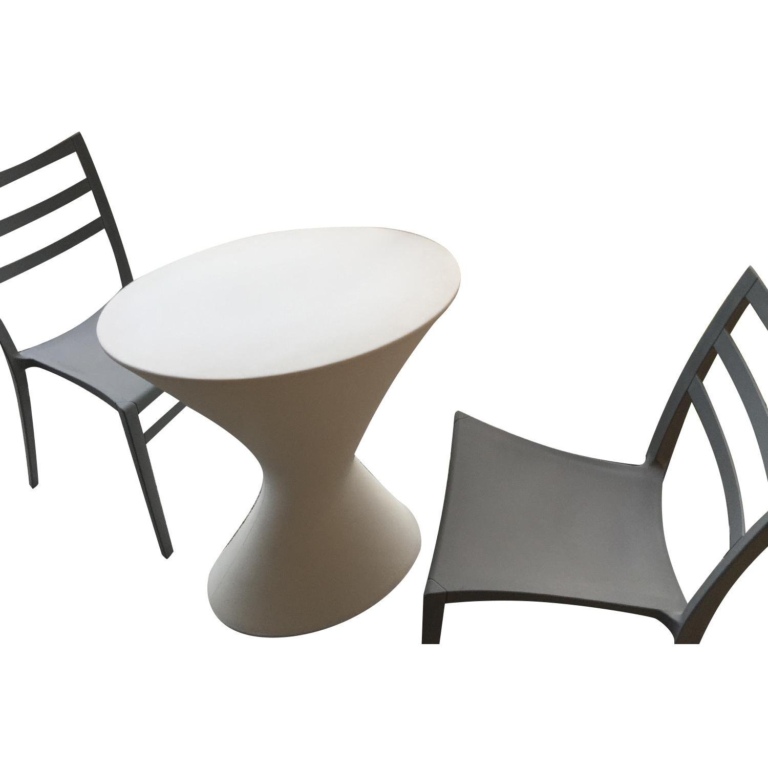 Seller's Notes:Patio table and chairs from Room & Board, which is perfect for a balcony as well. Moving to a unit without an outdoor space so it has to go unfortunately. The chairs are light grey and the table is white. All three pieces are water resistant.