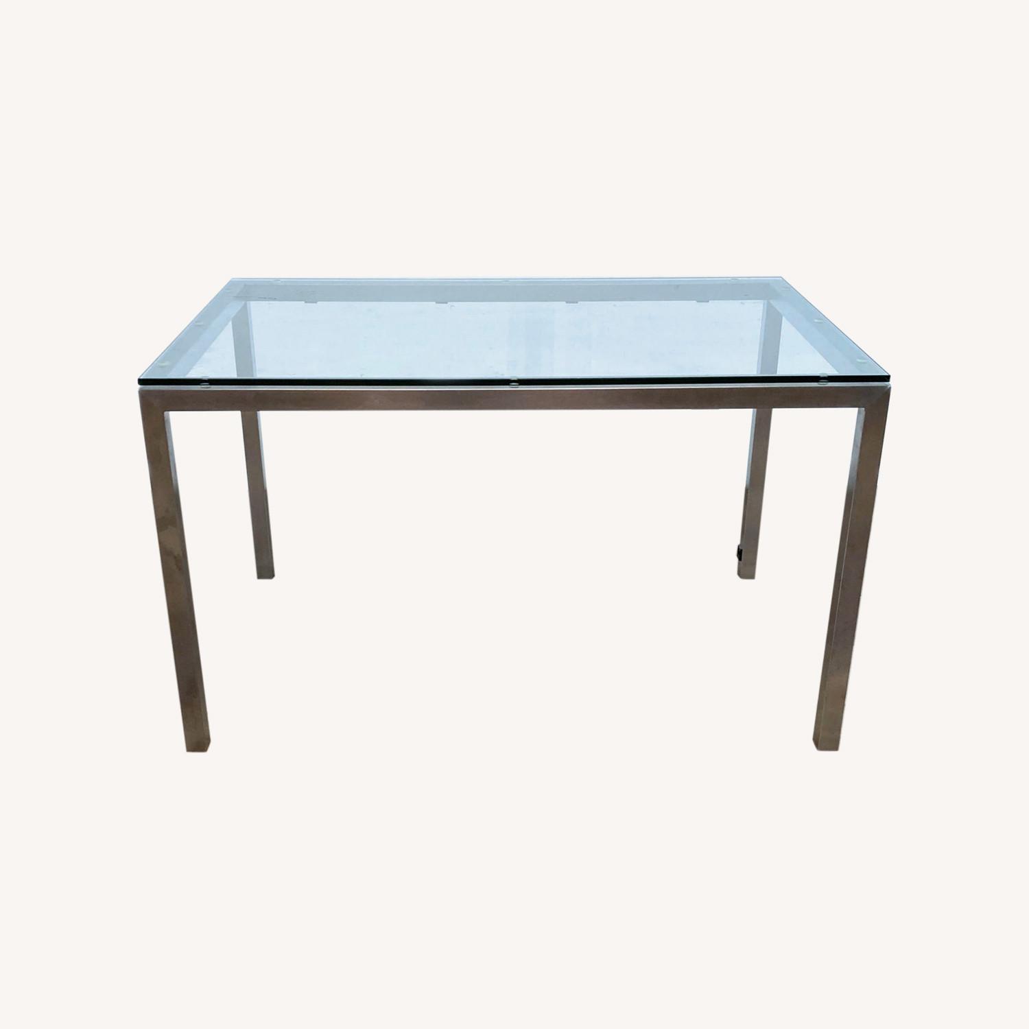 Seller's Notes:The Parsons desk from Room & Board has a steel hand welded base featuring USB and power outlets in one leg and is topped with tempered glass.. Brand: Room & Board. Model: Parsons. Material: glass. Retail price: $999. Gently used - any blemishes or damage will be included in the photos. #SKU: 1056815. Tags: metal,glass,industrial,modern
