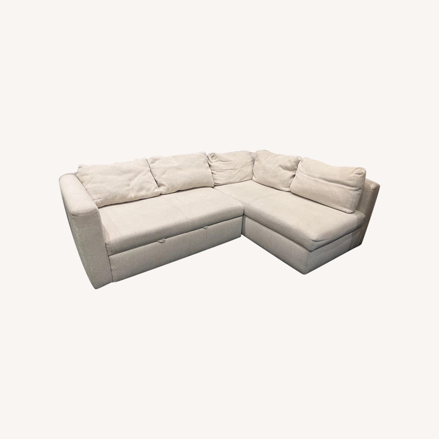 Seller's Notes:This Room & Board Oxford pop-up sleeper sectional has served our family well for 6 years but is too small for our new living room and is being replaced with its larger model. It is in fantastic shape. This is the 93" (smaller size) Oxford pop-up sleeper section in right-arm configuration (the storage chaise is on the right when you are facing the couch; on the left when you are sitting on it). I encourage you to visit the Room & Board listing for this item to get a better sense for how the sleeper configuration works, there's even a video. The biggest selling point of this piece is that the sleeper takes roughly 5 seconds to set up and turns the sofa in to an entirely flat bed, which and makes it great for putting up even for a movie night. The cushion is firm but comfortable and the pillows are in good shape but could stand to be fluffed. There are a few minor stains and blemishes. I had the couch professionally cleaned in 2020 and it returned it to like-new state; I expect another relatively cheap professional cleaning will eliminate all the new light stains. The storage chaise arms were just replaced (by Room & Board) a few weeks ago in preparation for selling this. The storage lid opens smoothly and the new replacement arms hold it perfectly still upright as long as you need. I priced it very affordably because I want it to go to a new home and not be wasted. It is in excellent shape and we would probably use it for another 6 years were it not too small for our space.