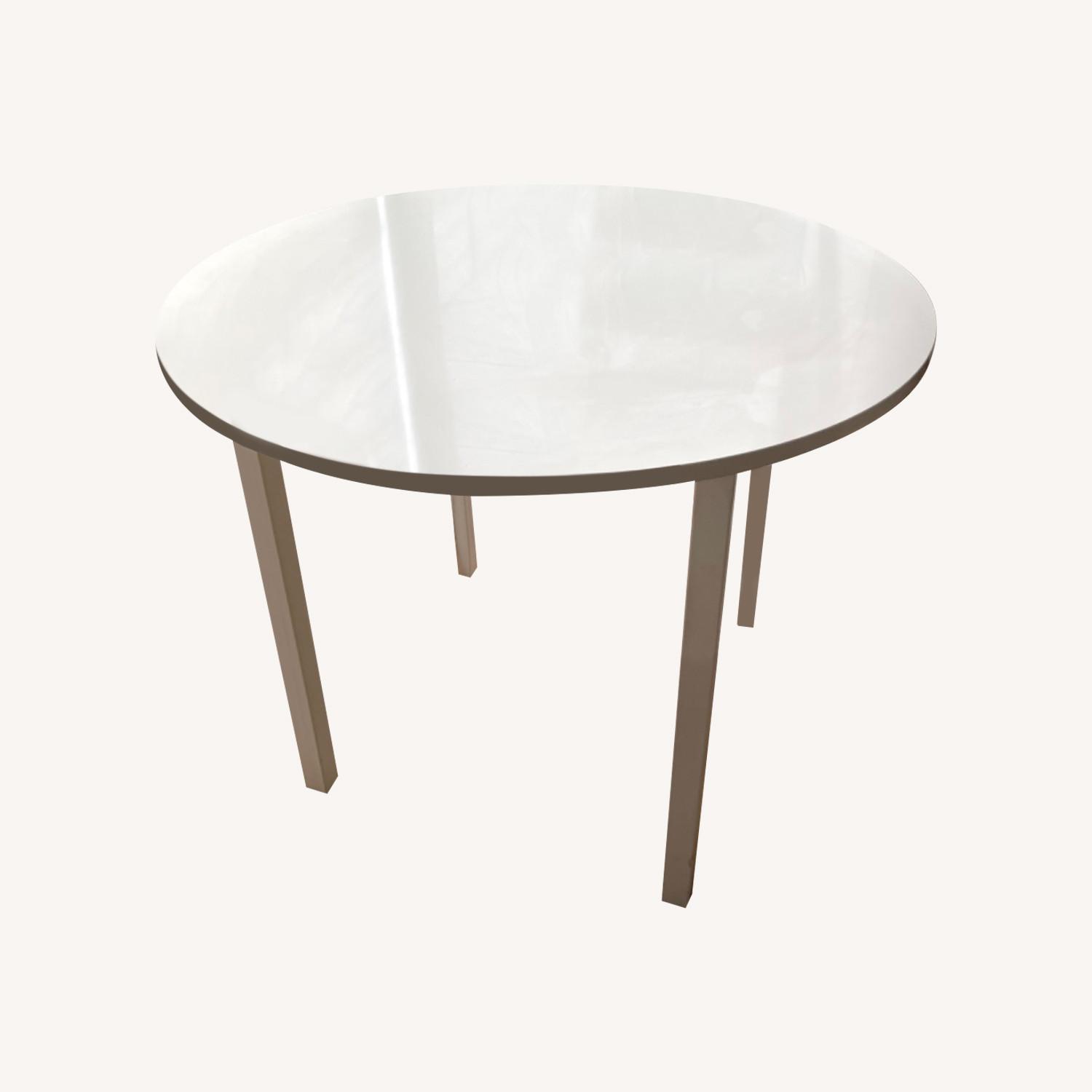 Seller's Notes:Quartz top with powder coated steel base. White on white. The top is heavy and in like-new condition. It’s made of quartz so it will last forever. The steel base has some marks. It’s very stable. Not wobbly. The table is 2 separate pieces which makes it easy to move. Pet-free and smoke-free home.